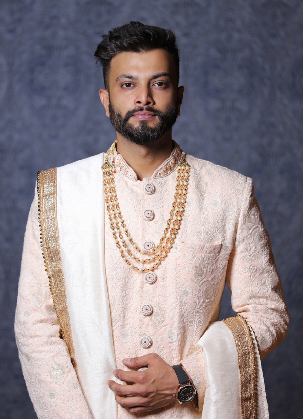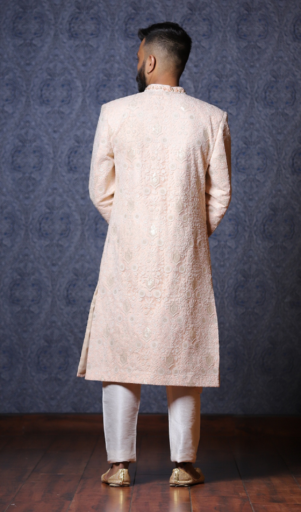 Rent this Peach Sherwani adorned with tonal embroidery, complemented by a stole for a sophisticated and modern look.