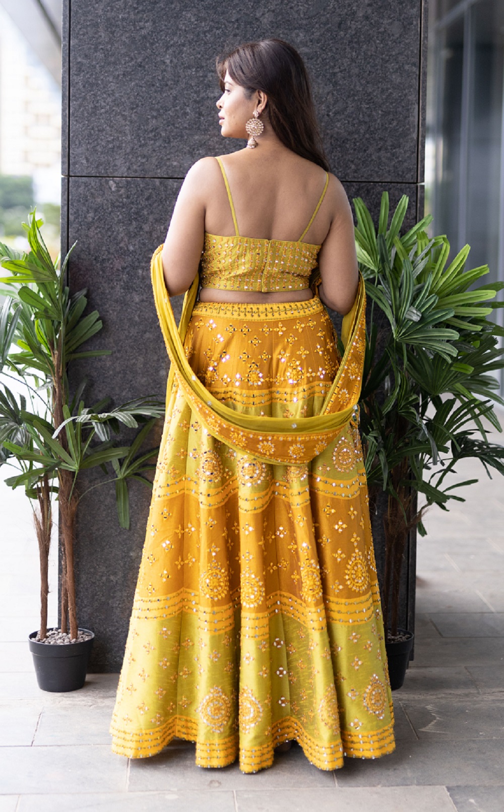 Yellow-green lehenga in dupion silk base with mirror embroidery, paired with a matching blouse and dupatta.