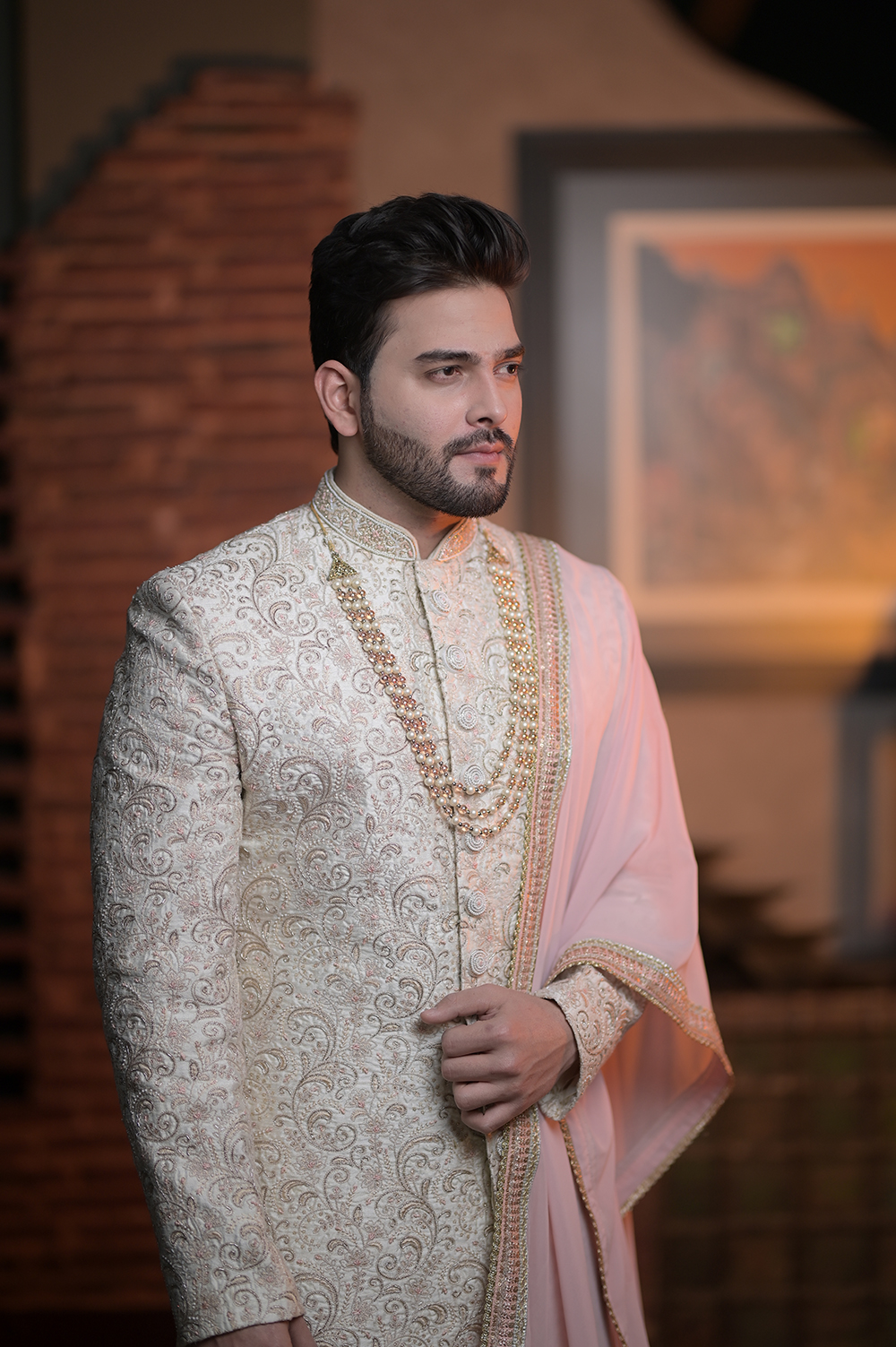 Rent this Cream sherwani with intricate floral embroidery and golden pleated dupatta and matching pajama, for a classic and elegant ensemble.