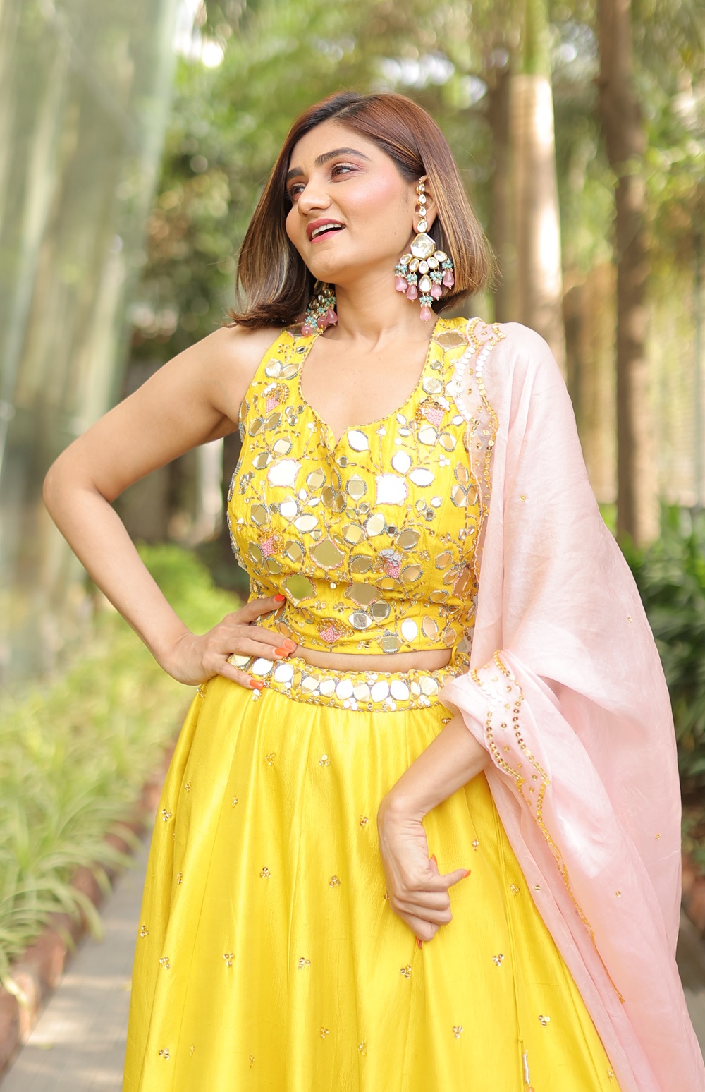 Rent this vibrant yellow designer lehenga set, featuring striking chunky mirror work and a contrasting pink dupatta for a bold and festive look.