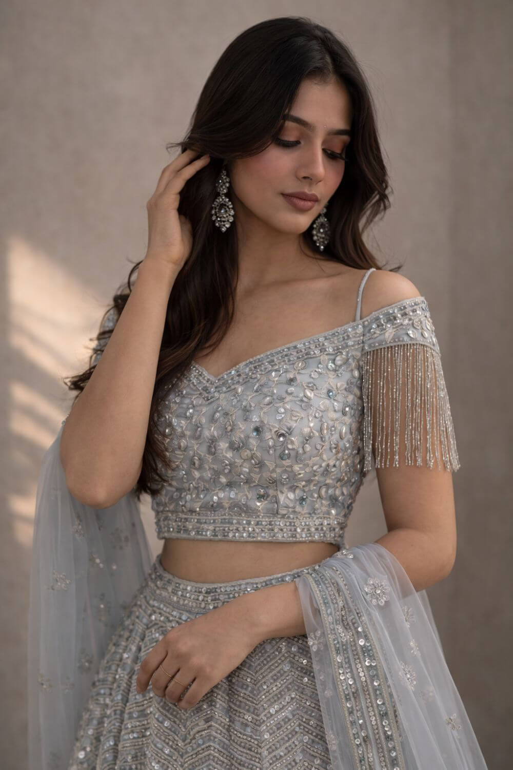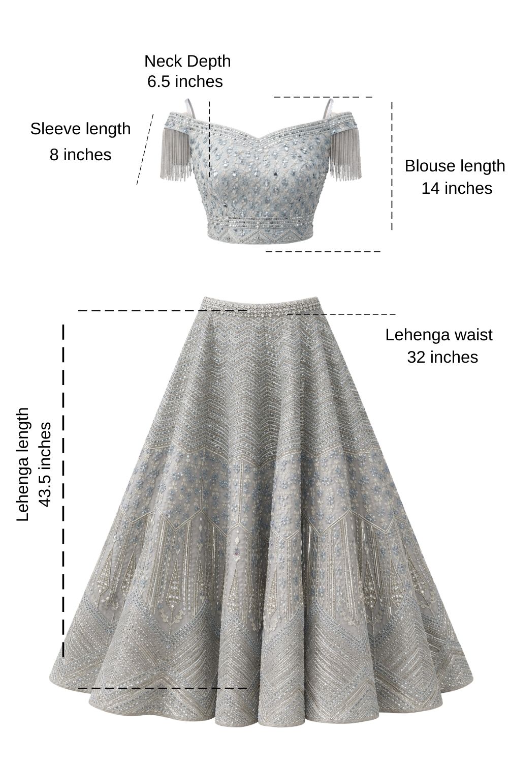 Rent this embellished powder blue lehenga set featuring a fringe-detailed blouse and dupatta.