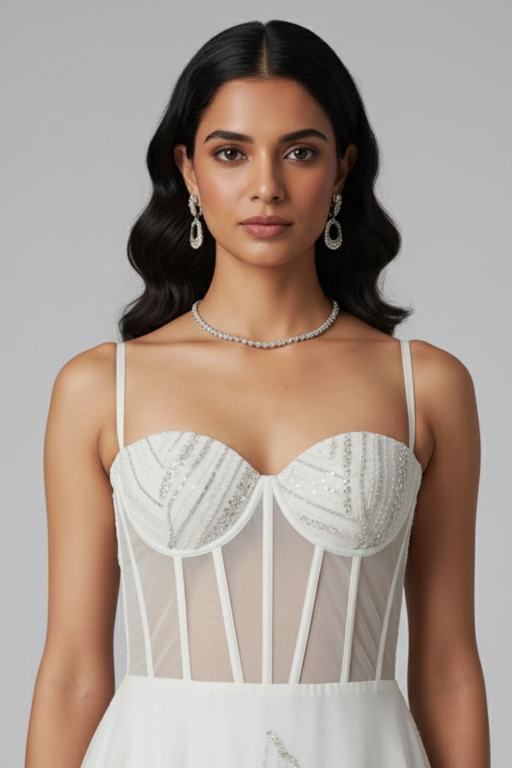 Rent this white corset gown with frills and transparent net detailing on top, offering a captivating blend of allure and elegance.