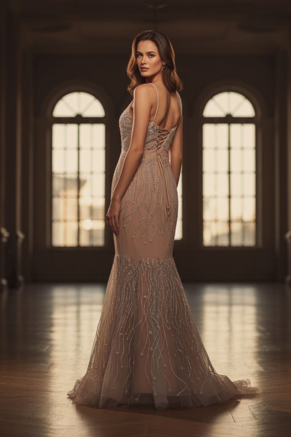 Rent this chic yellow mermaid gown crafted from net and satin fabric, featuring delicate spaghetti straps and intricate silver thread, sequin, and bead work with floral accents on the bodice and a flared, embellished hem.