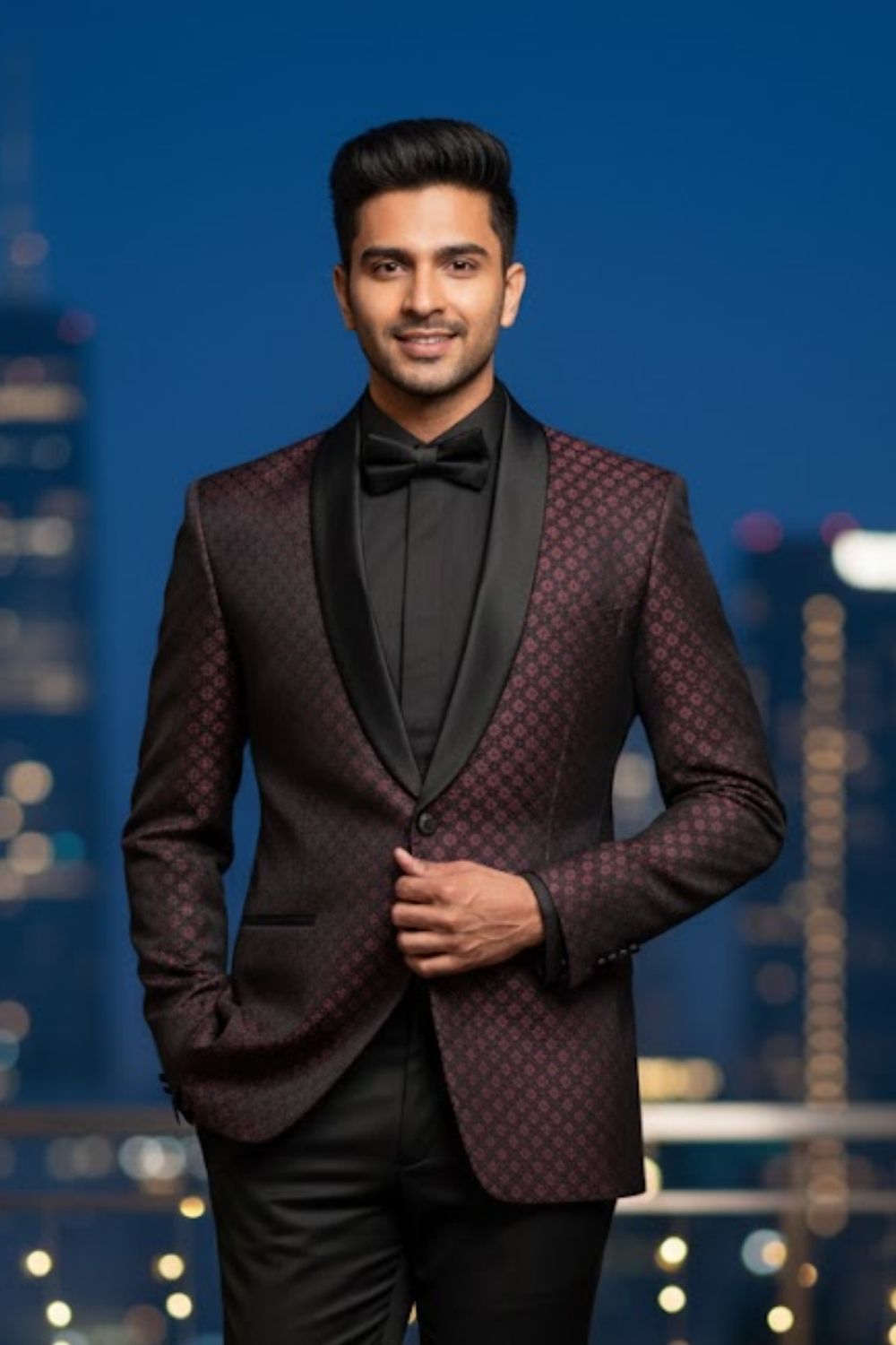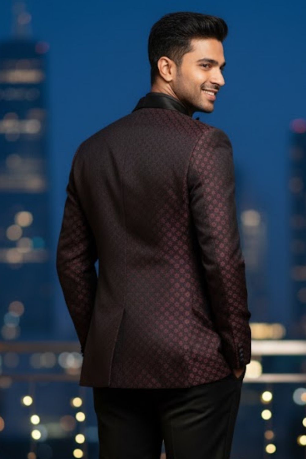 Rent this sophisticated maroon and black Tuxedo, featuring an all-over geometric patterned weave and a classic satin shawl lapel.