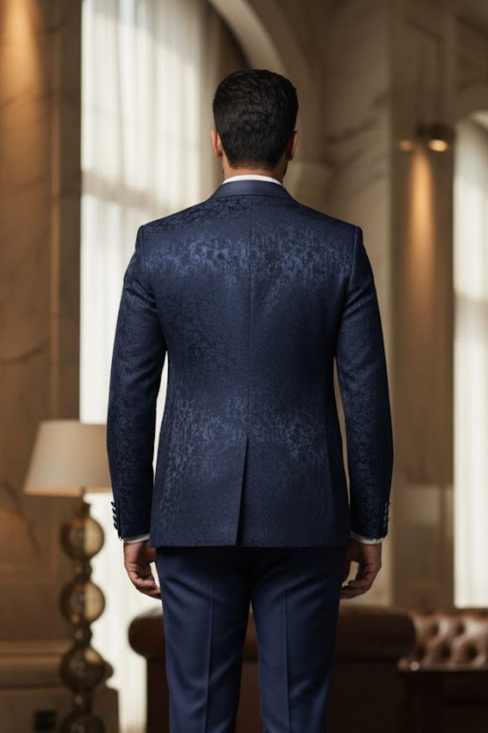 Rent this elegant navy blue three-piece suit in a textured fabric, showcasing a beautiful self-woven floral texture and clean, plain shawl collars.