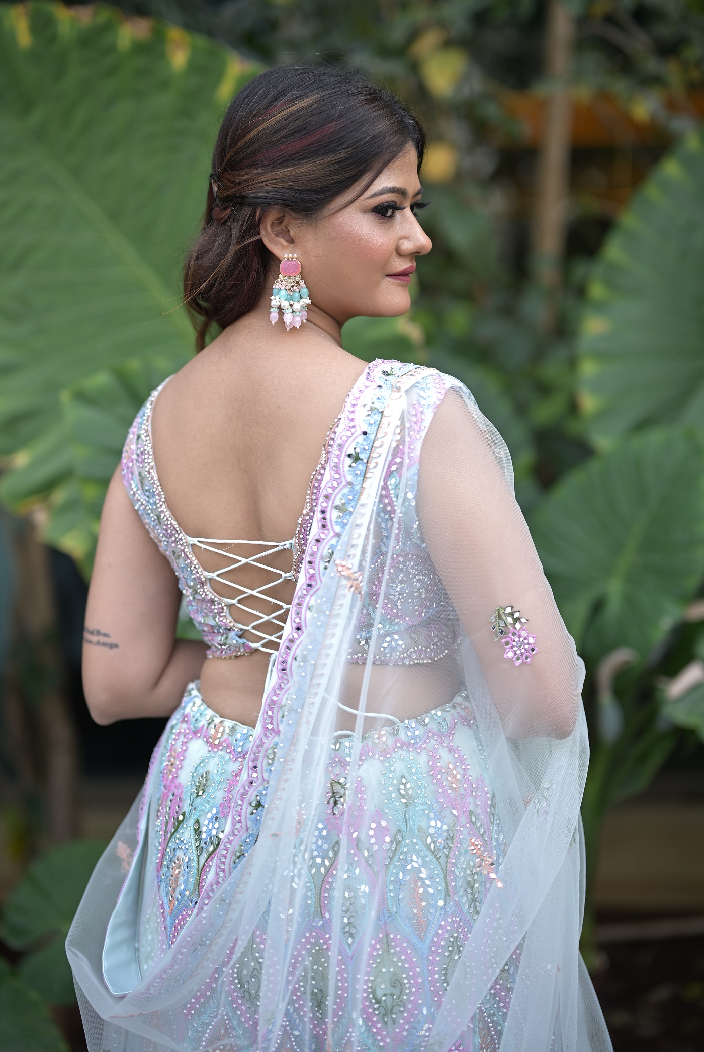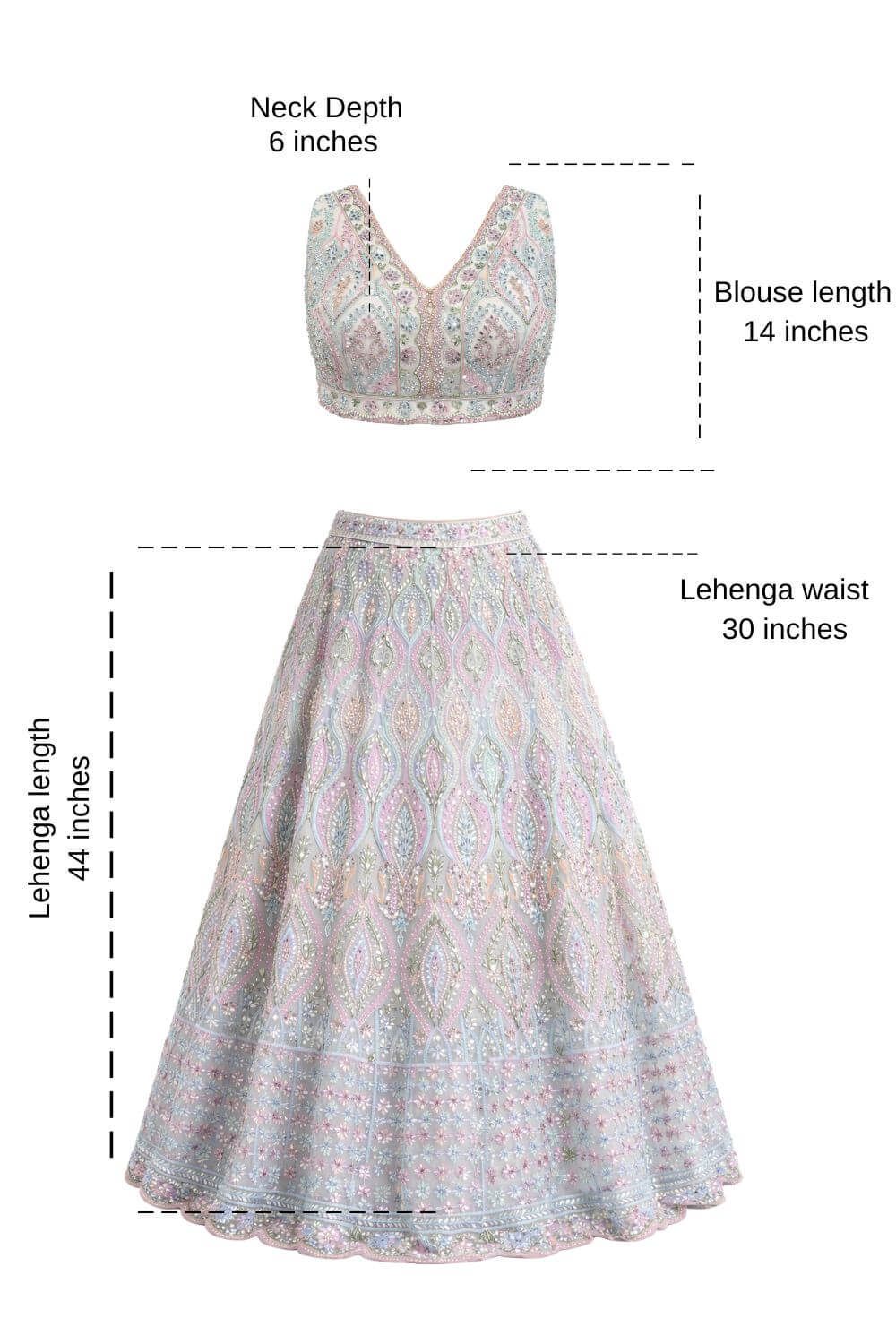 Rent this enchanting powder blue lehenga set crafted from net fabric, featuring exquisite multi-colored thread, sequin, and bead embroidery in pastel shades, complete with a blouse and a coordinated sheer net dupatta.