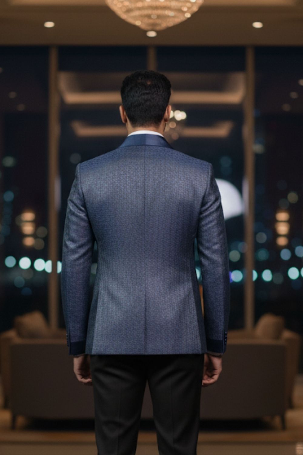 Rent this tailored blue tuxedo with a bold textured pattern, over it a blue satin lapel, for a standout evening ensemble.