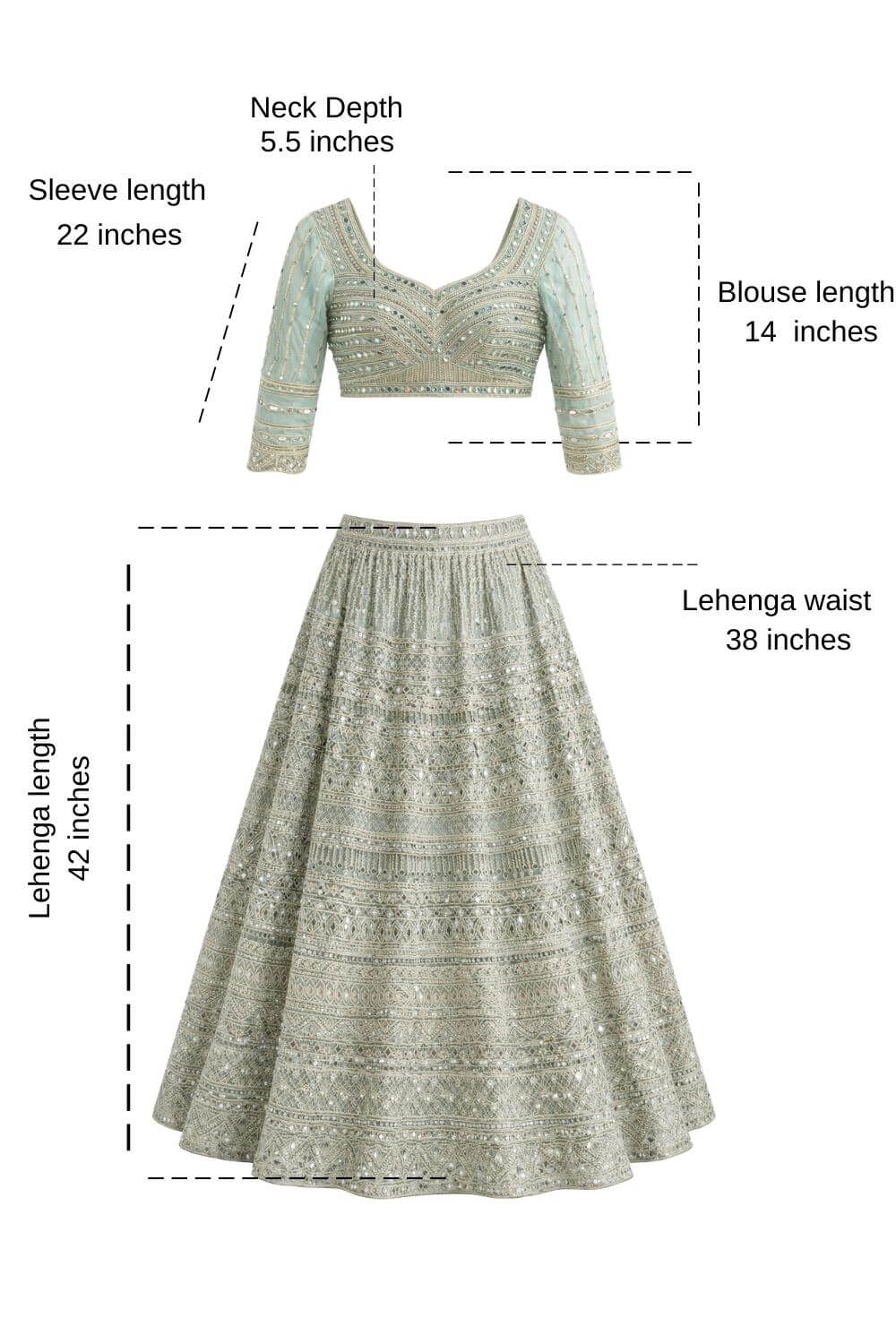 Rent this sea green net lehenga featuring intricate mirror and threadwork, back opening blouse, adjustable drawstring waist, and flowing dupatta, perfect for sangeet, reception, and weddings.