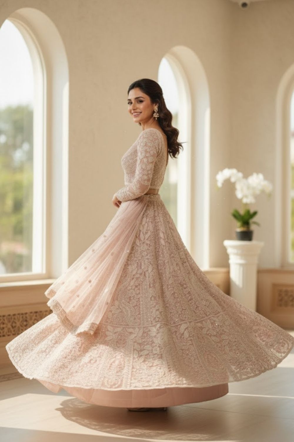 Rent this exquisite nude beige lehenga with a net overlay, adorned with dense floral thread embroidery and shimmering silver detailing styled with blouse and a dupatta.