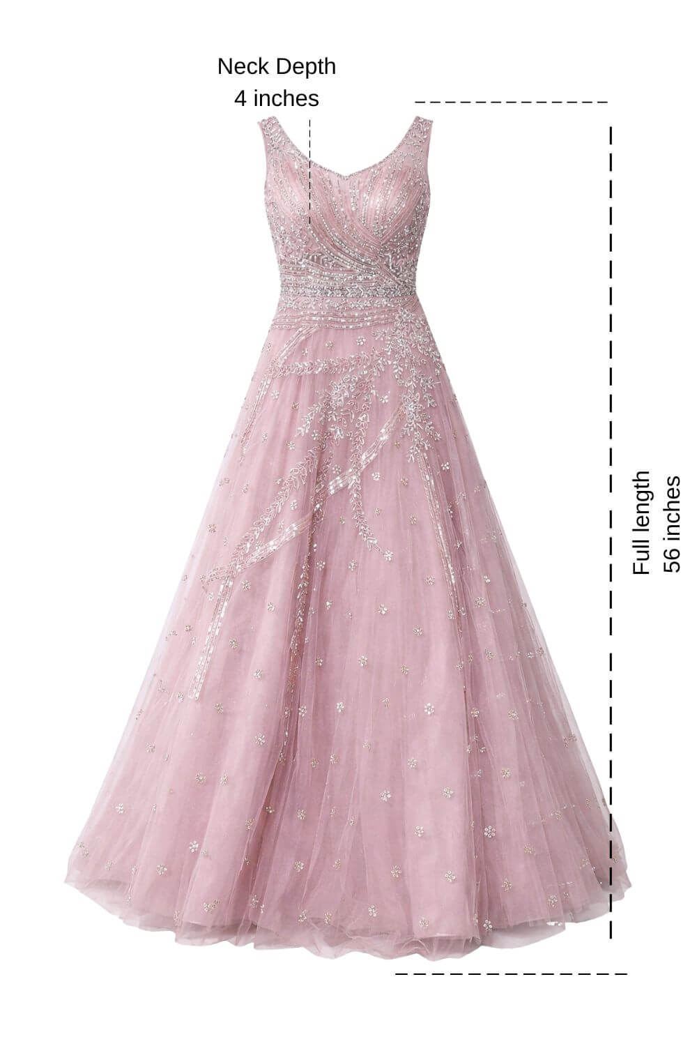 Rent this stunning lilac gown crafted from sheer net fabric, featuring a fully beaded and sequined bodice with a flattering V-neck, and a voluminous skirt with scattered silver embellishments.