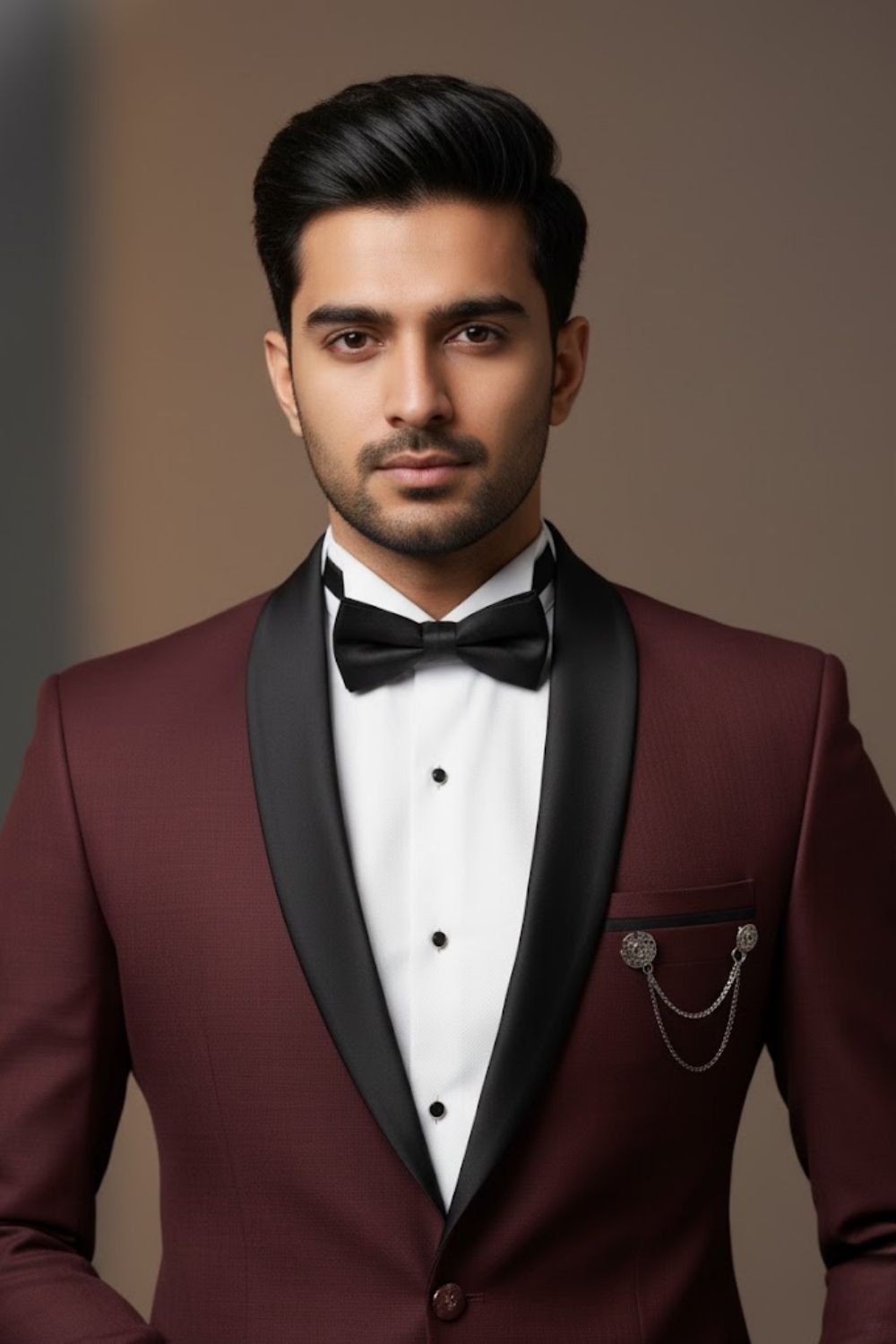 Rent this bold maroon tuxedo in a fine fabric, accented by a contrasting black satin shawl lapel and clean tailoring.