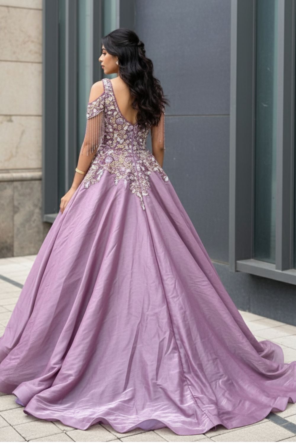 Rent this glamorous purple gown with a full, flowing satin skirt, a heavily embellished bodice featuring elegant bead fringe on the cold-shoulder straps, and multi-colored sequin work.