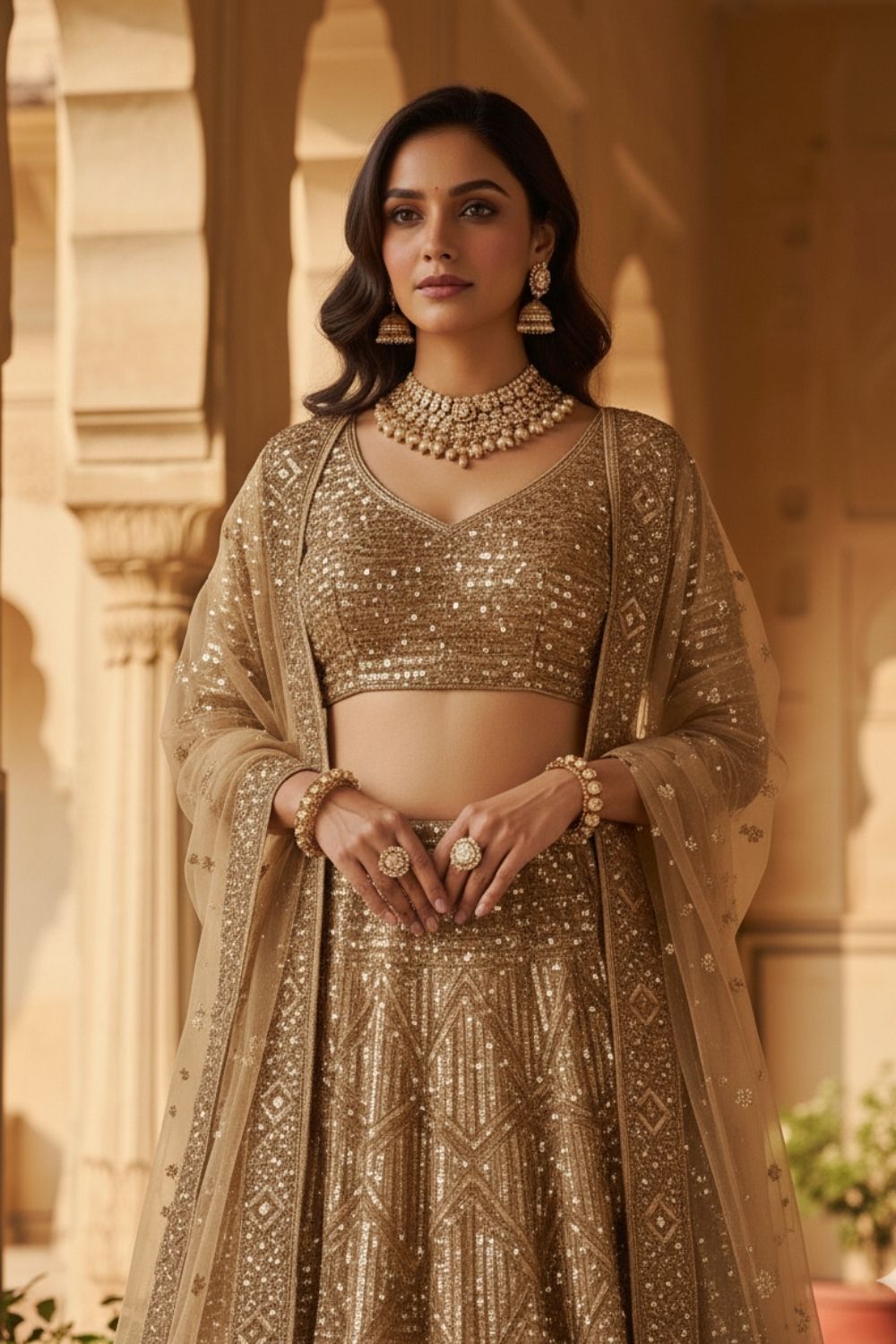 Rent this magnificent gold lehenga set crafted from net fabric, featuring heavy all-over sequin and bead work in a striking geometric pattern, complete with a matching fully-sequined blouse and a coordinated net dupatta.
