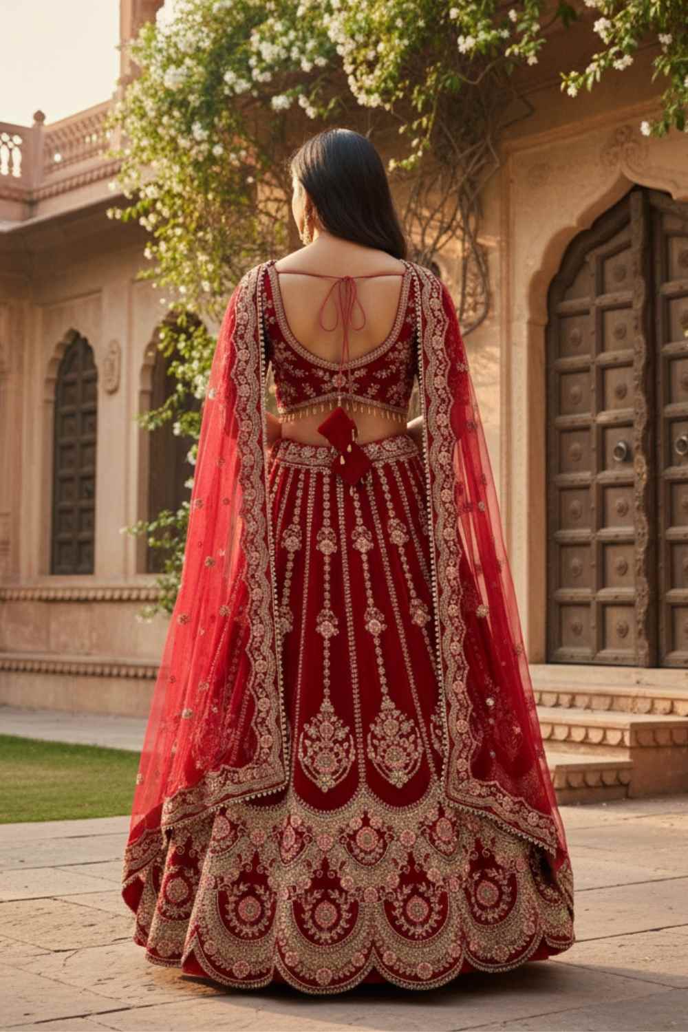 Rent this rich red velvet bridal lehenga featuring intricate Zardozi and zari work. The stunning ensemble includes a heavily embroidered lehenga, choli, and single dupatta.