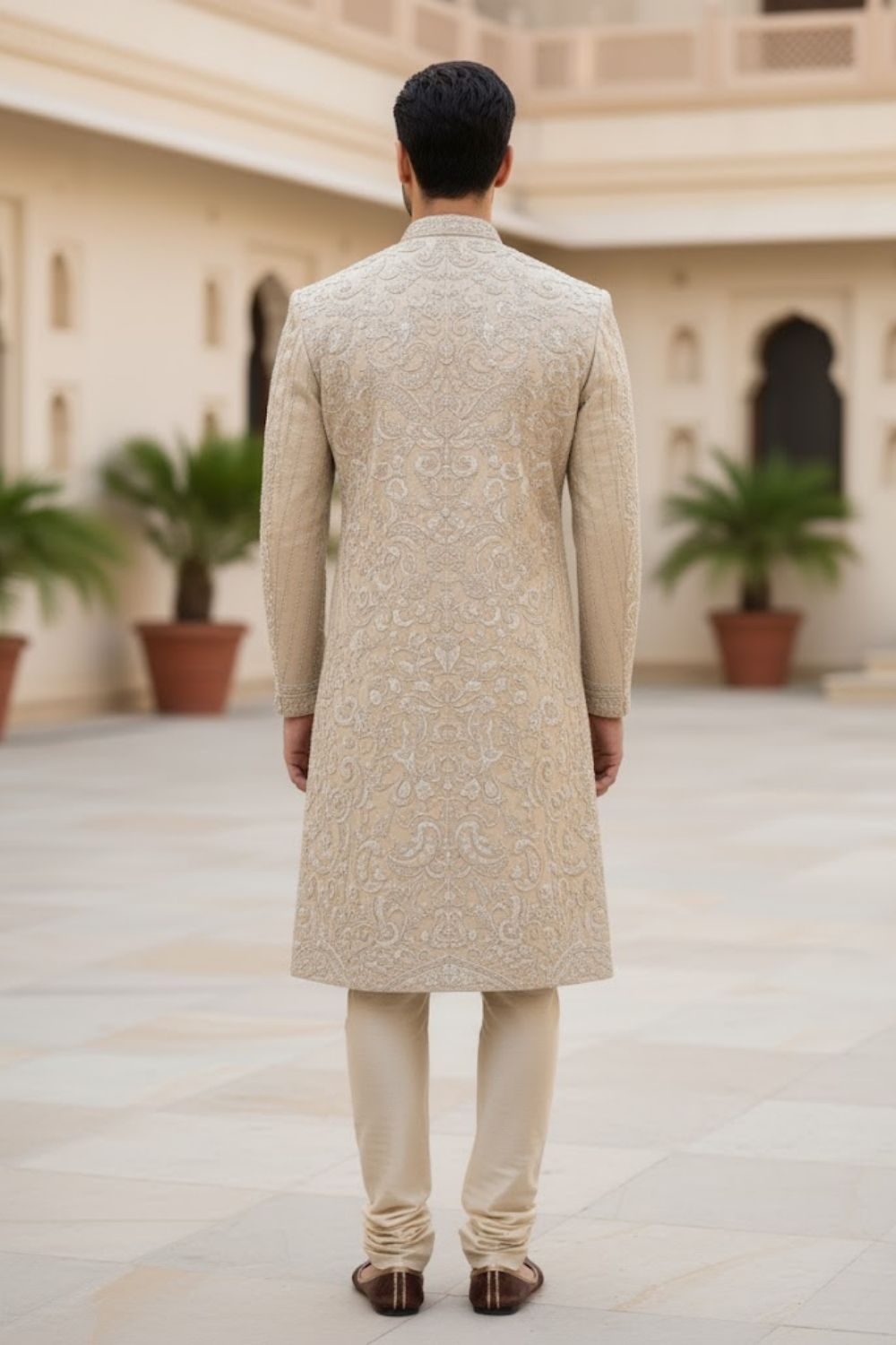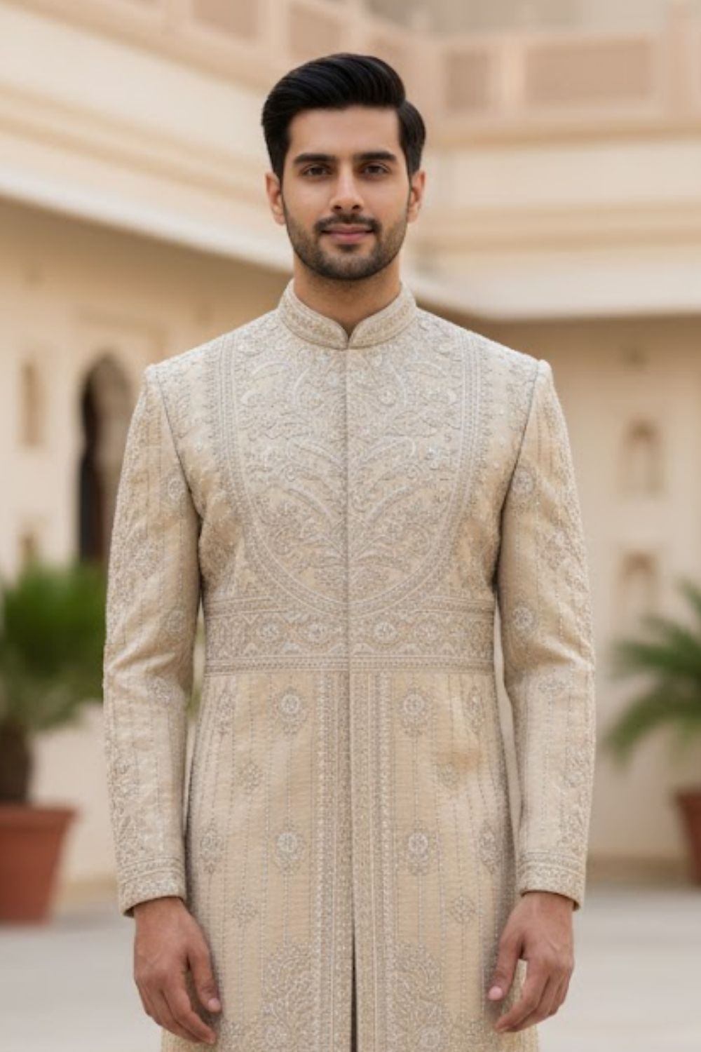 Rent this majestic beige sherwani with a stole, crafted on raw silk fabric and featuring all-over gold Zari and thread embroidery.