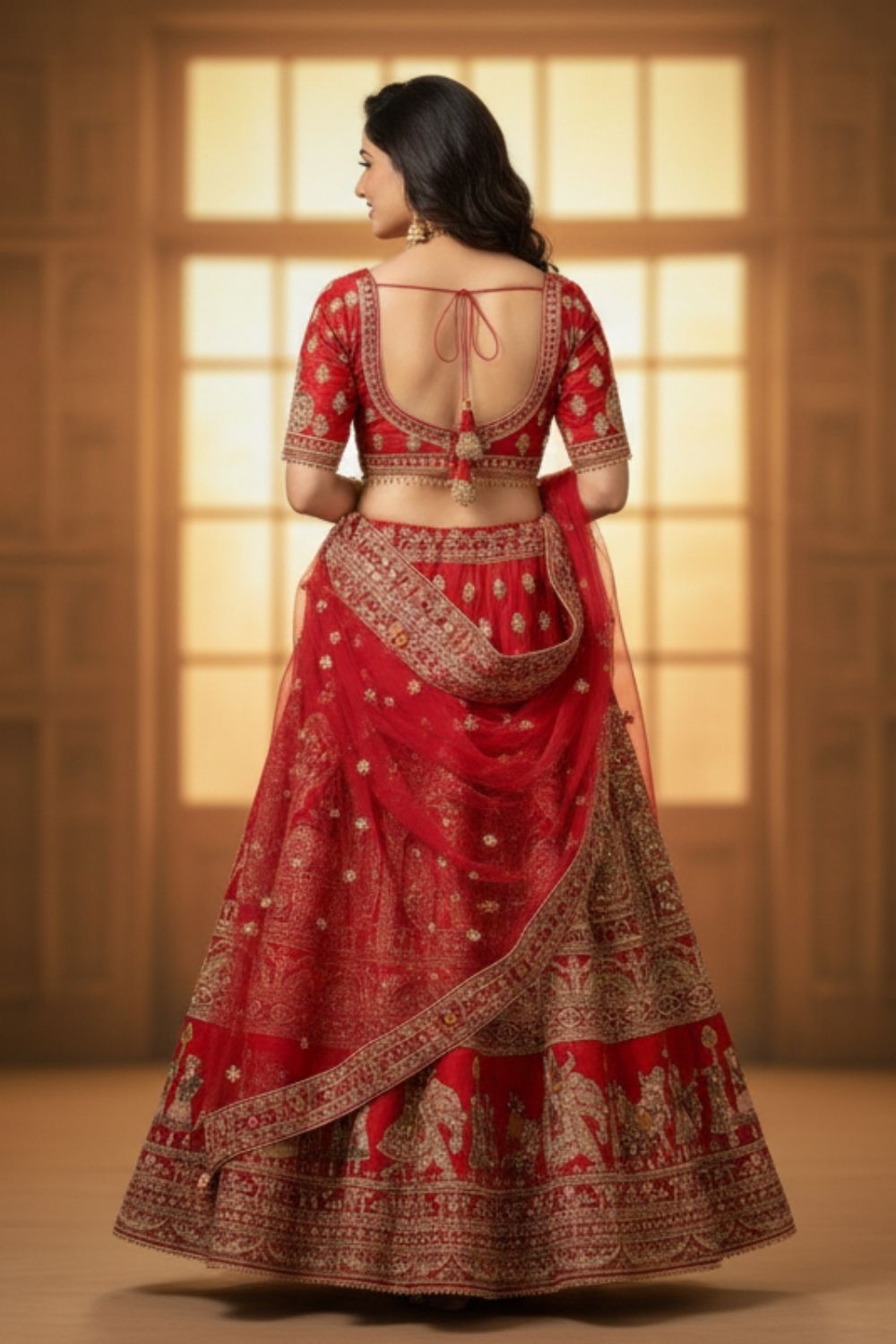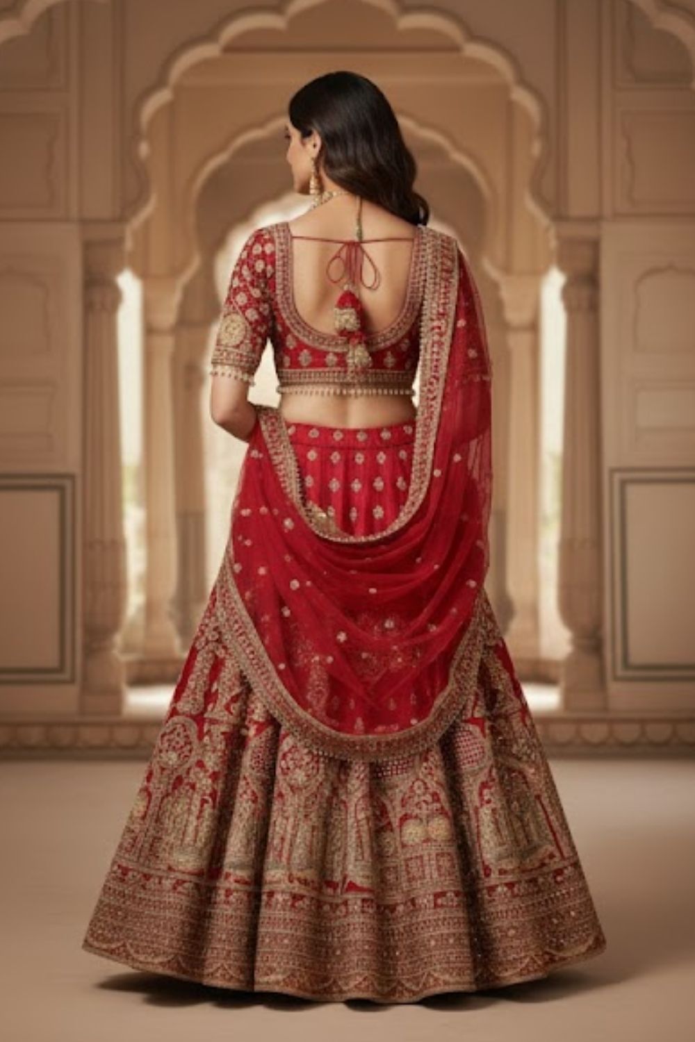 Red bridal lehenga styled with a blouse, belt and double dupatta