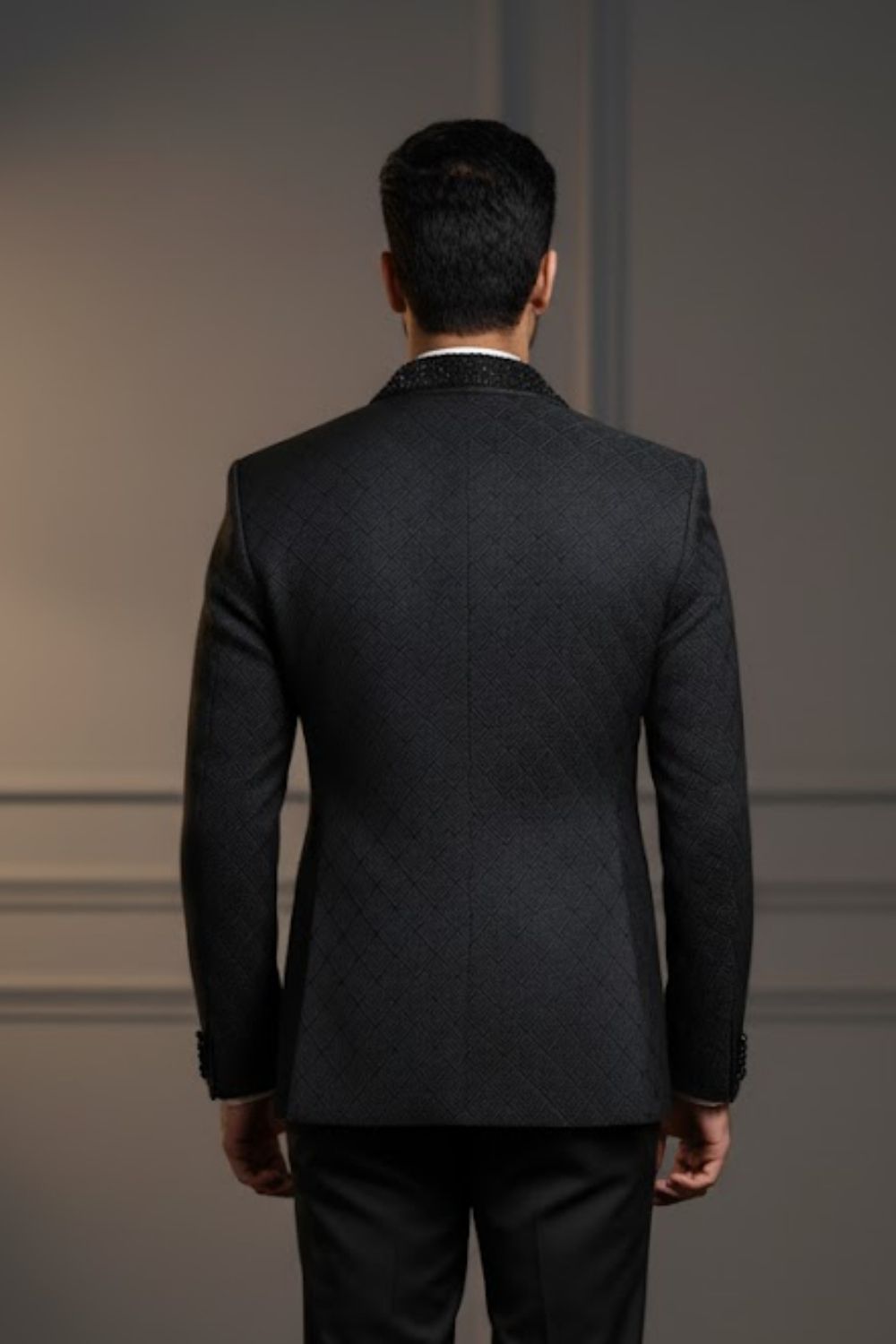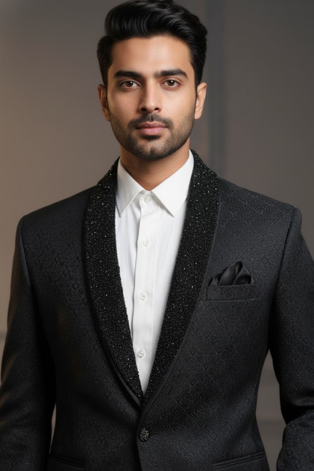 Rent this premium black tuxedo, crafted from textured jacquard fabric and embellished with an opulent all-over black beadwork detailing the shawl lapel and body pattern.