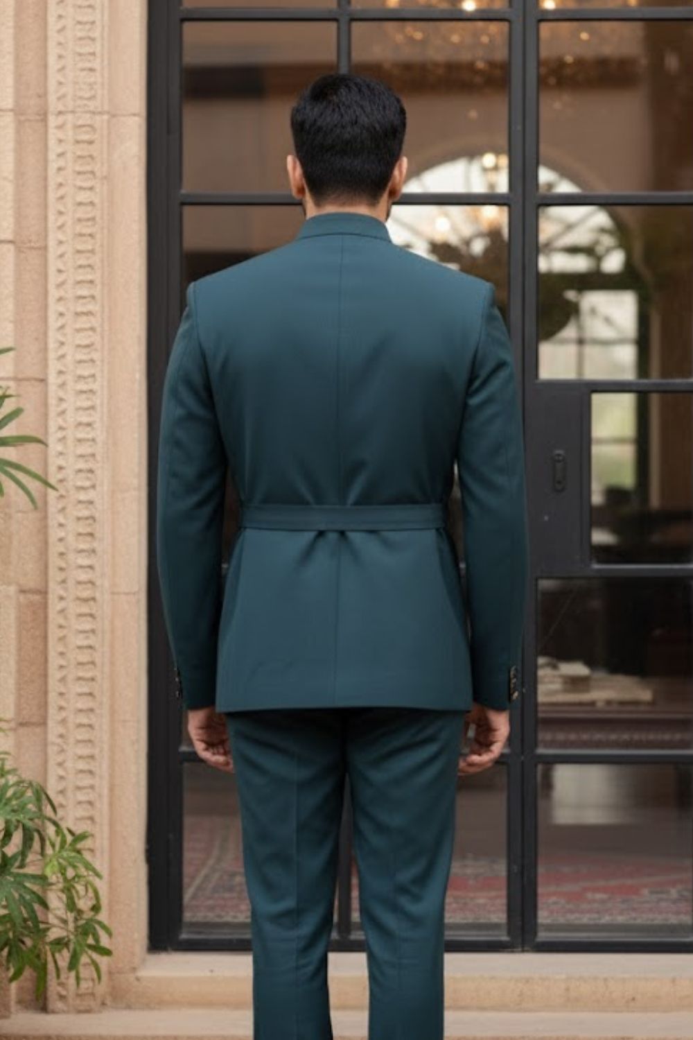 Rent this modern dark green bandhgala indo-western, showcasing a clean, work-free design with a unique overlap style.
