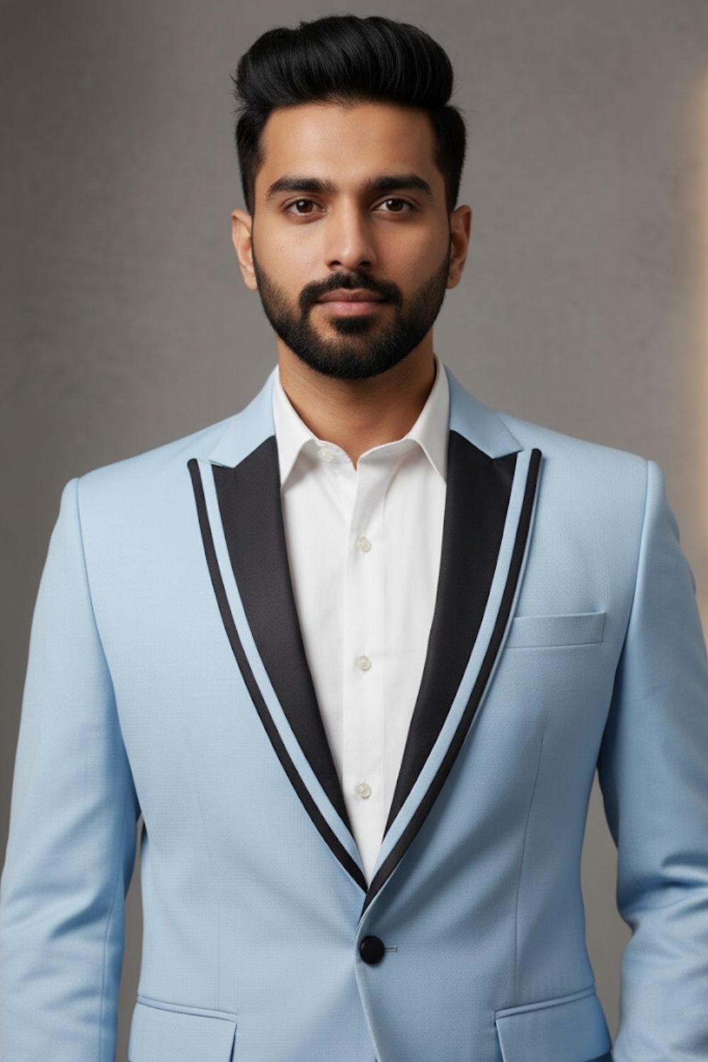 Rent this striking powder blue blazer in smooth suiting fabric, featuring a dramatic black satin shawl lapel with white piping for a standout party or reception look.