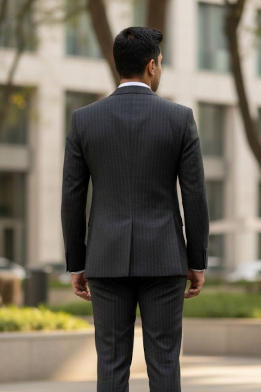 Rent this classic black single-button blazer, featuring a subtle vertical white pinstripe work.