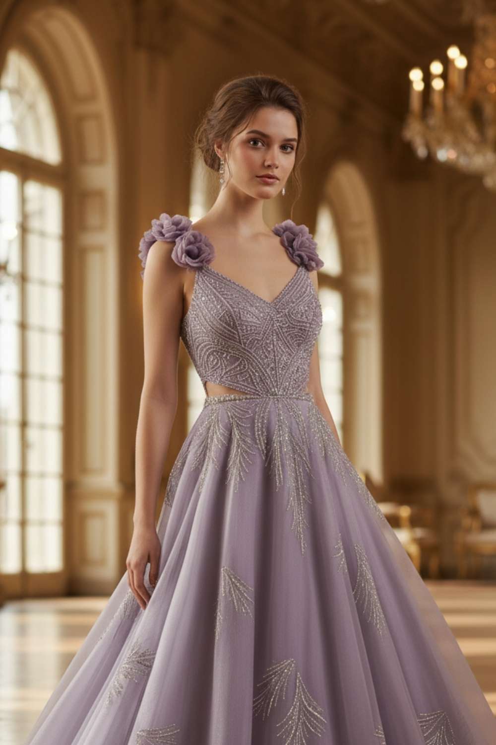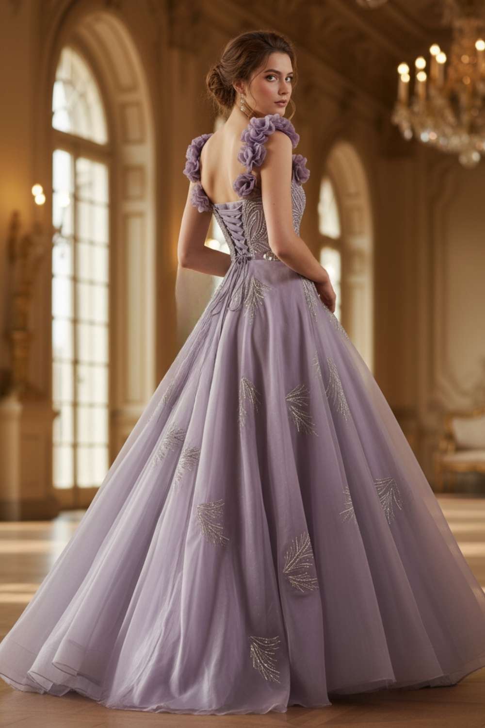 Rent this dreamy lavender evening gown made from delicate organza, adorned with sparkling silver embroidery on the skirt and a fully beaded corset top with unique 3D floral accents on the straps.