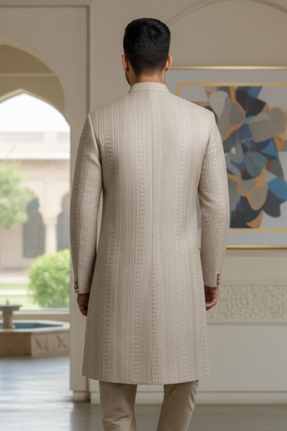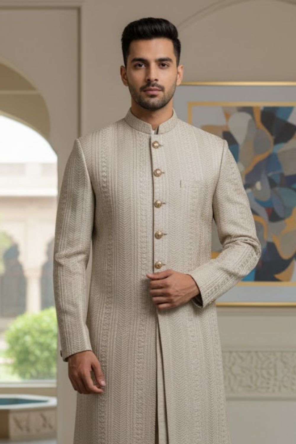Rent this stylish beige sherwani with a jacket, featuring a textured fabric with a prominent chevron self-weave and metallic buttons.