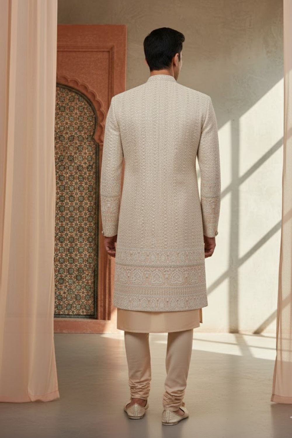 Rent this elegant peach designer Sherwani with jacket, featuring intricate all-over thread and sequin embroidery for a sophisticated look.