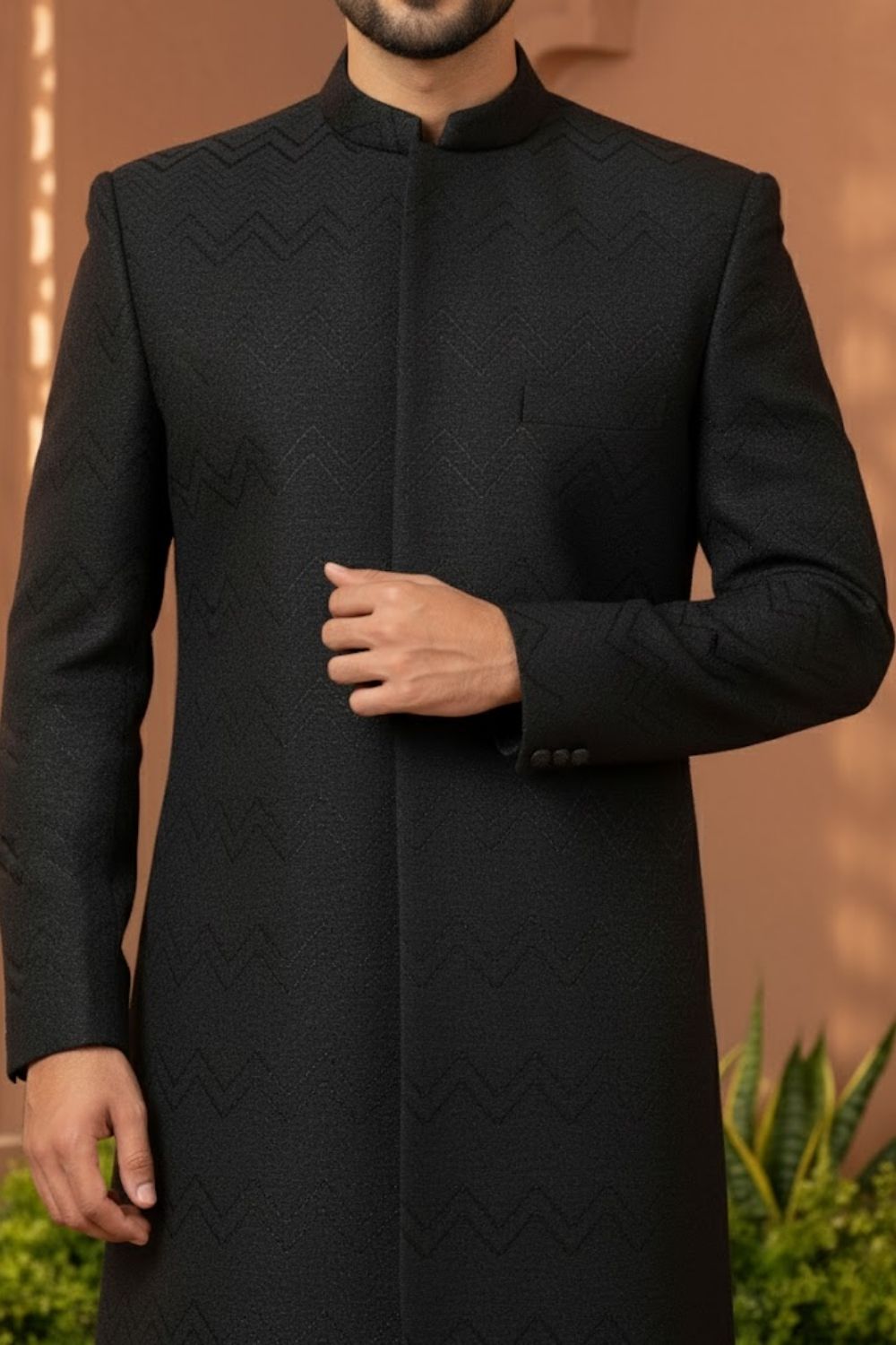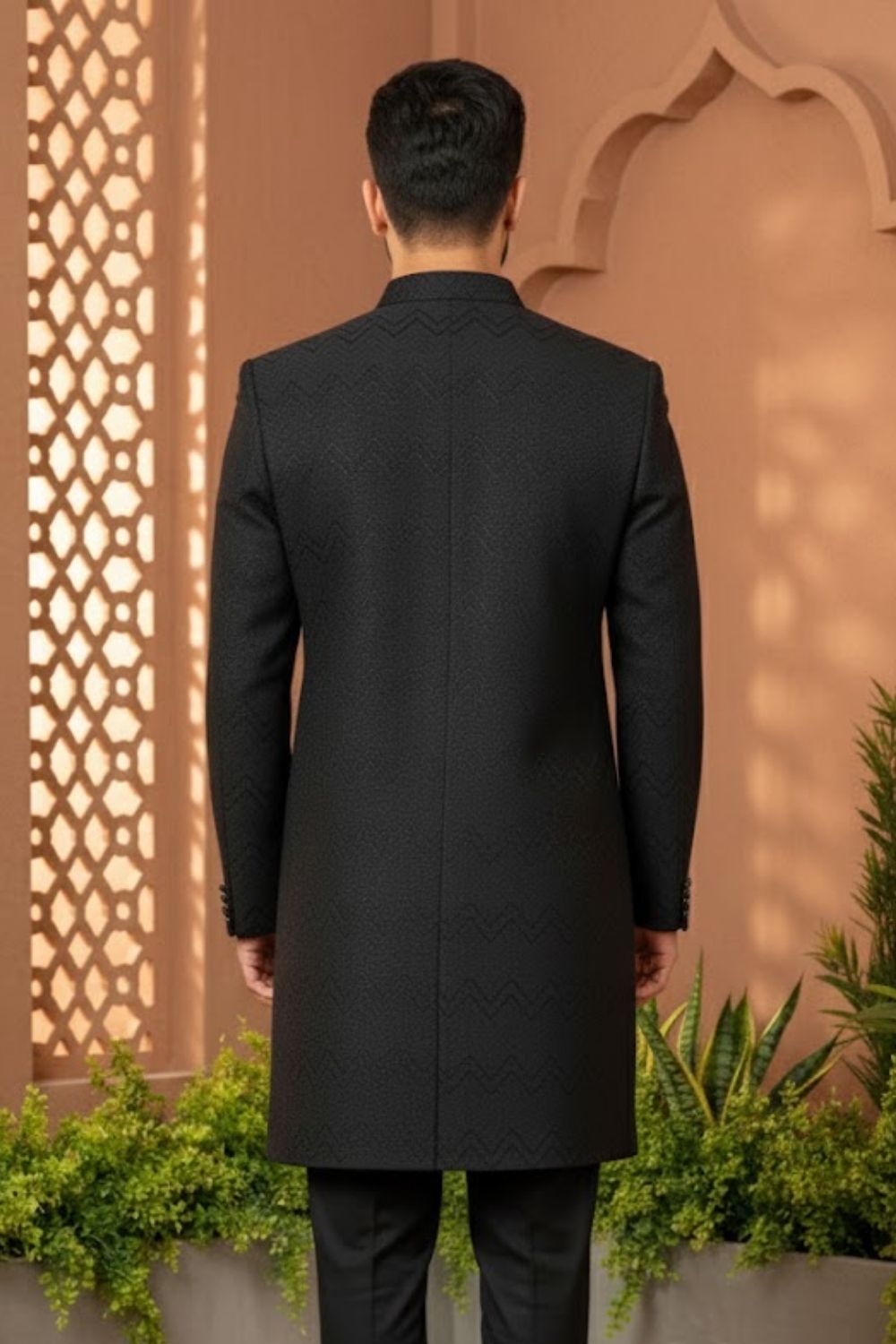 Rent this black long-line jacket in textured suiting fabric, featuring subtle tone-on-tone self-weave work in a zig-zag pattern.