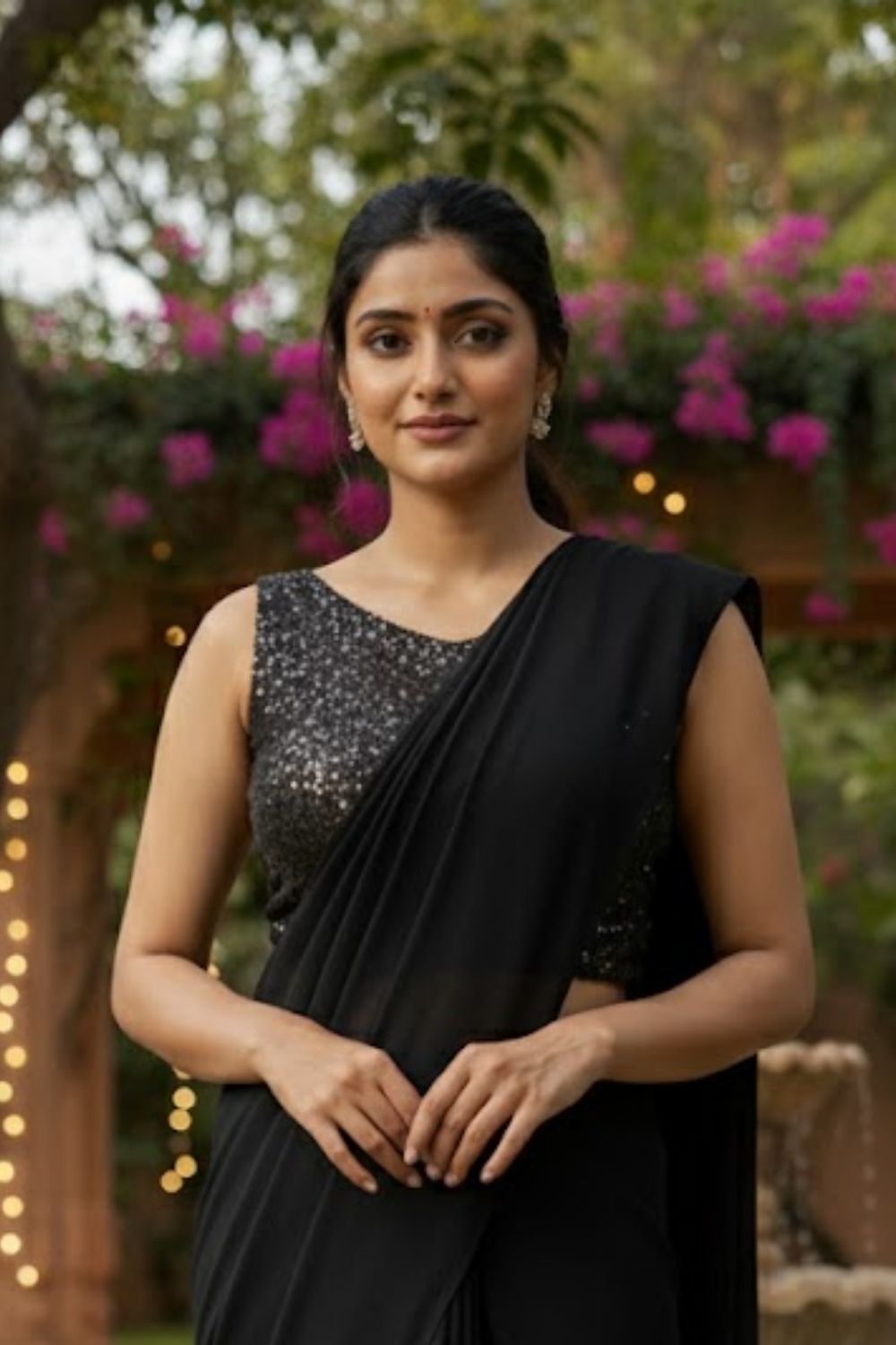 Rent this timeless classic black pre-draped saree, crafted from luxurious georgette fabric, paired with one-shoulder blouse featuring all-over sequin shimmer work.