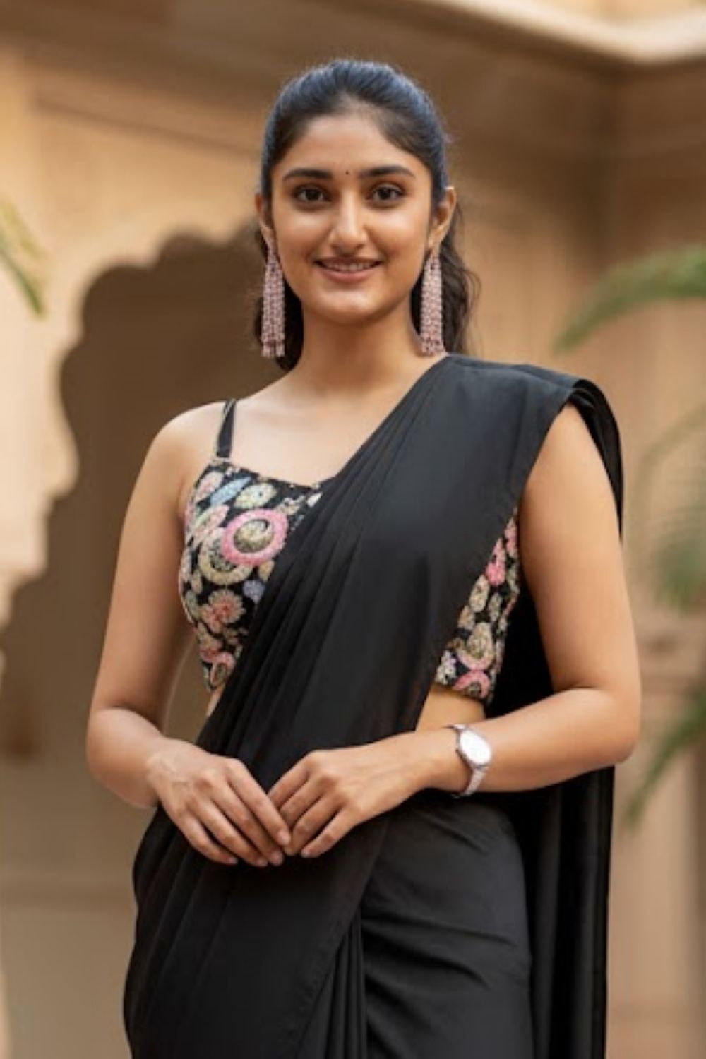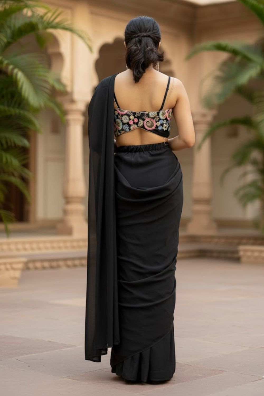 Rent this elegant solid black pre-draped saree, crafted from comfortable crepe fabric, paired with a vibrant multi-color floral embroidered sleeveless blouse.