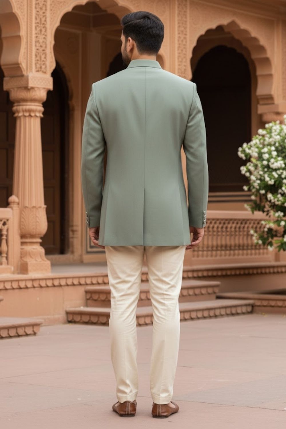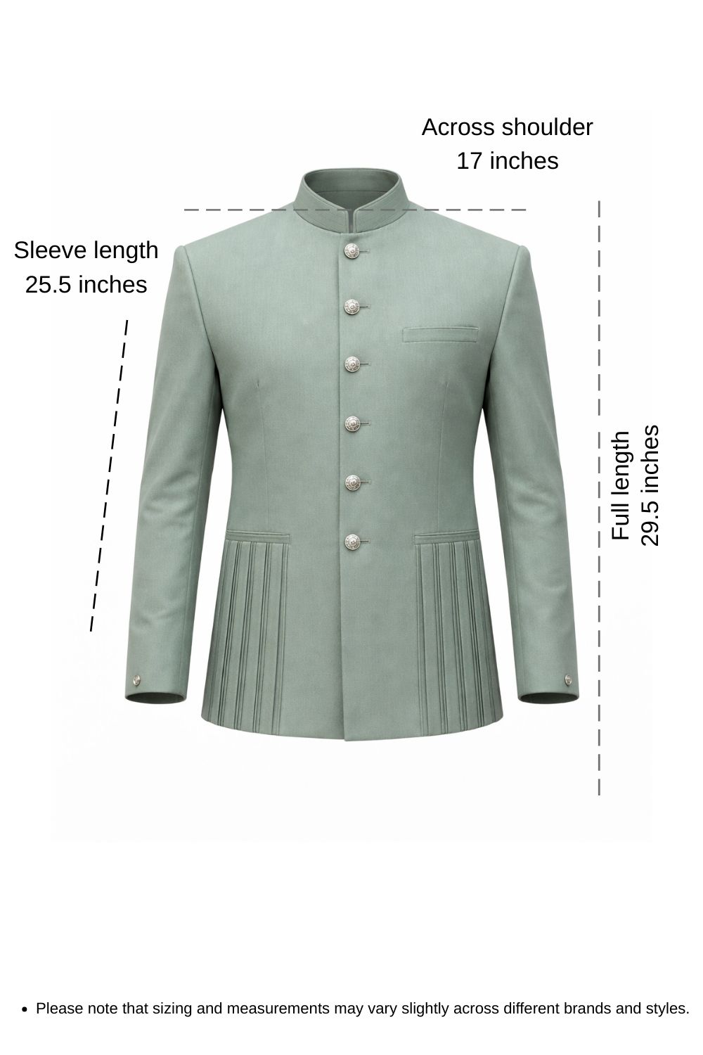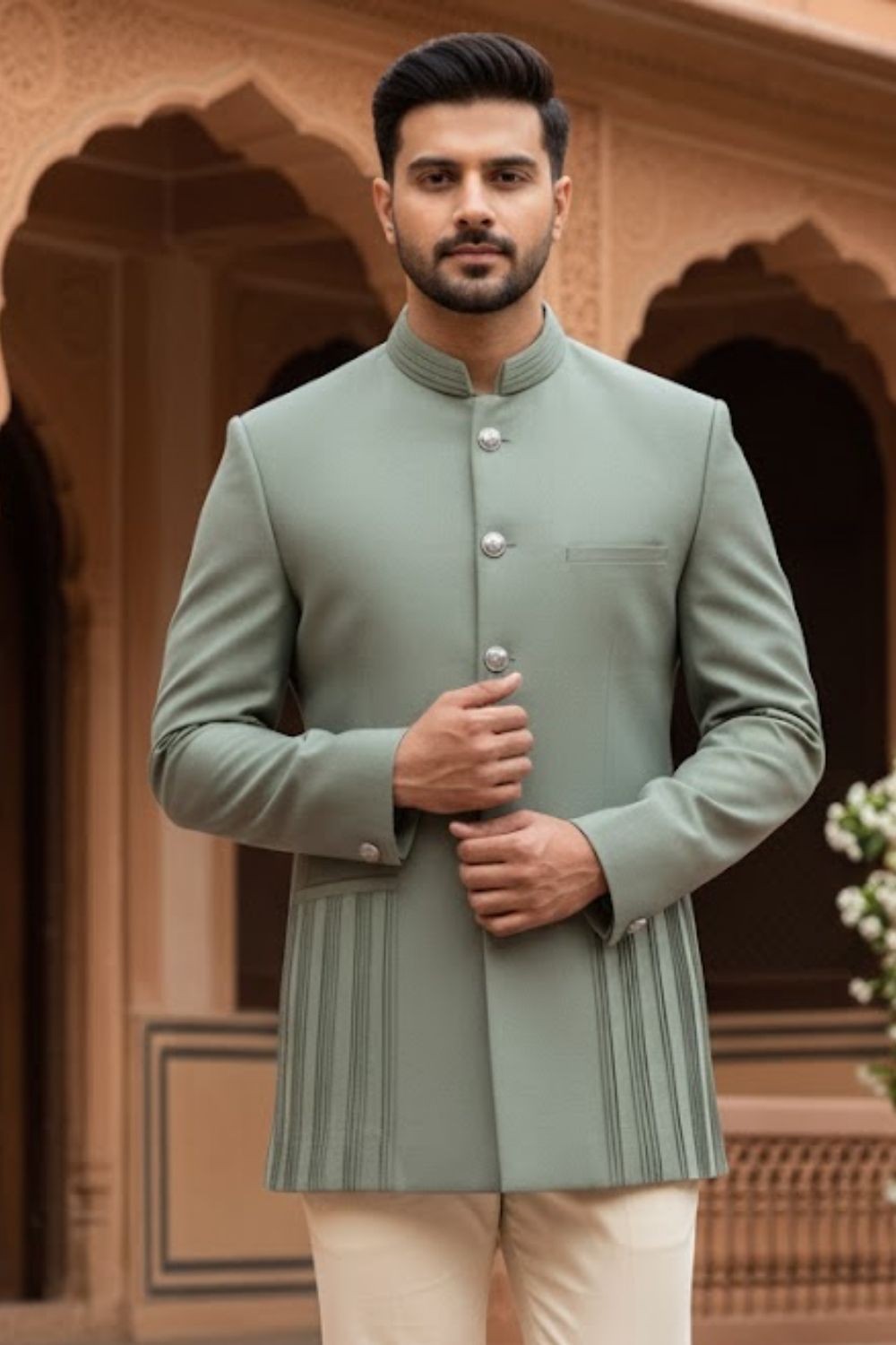 Rent this for your festive ceremony: a sophisticated green silk blend jodhpuri suit with a sleek pleated panel detailing on the seams.