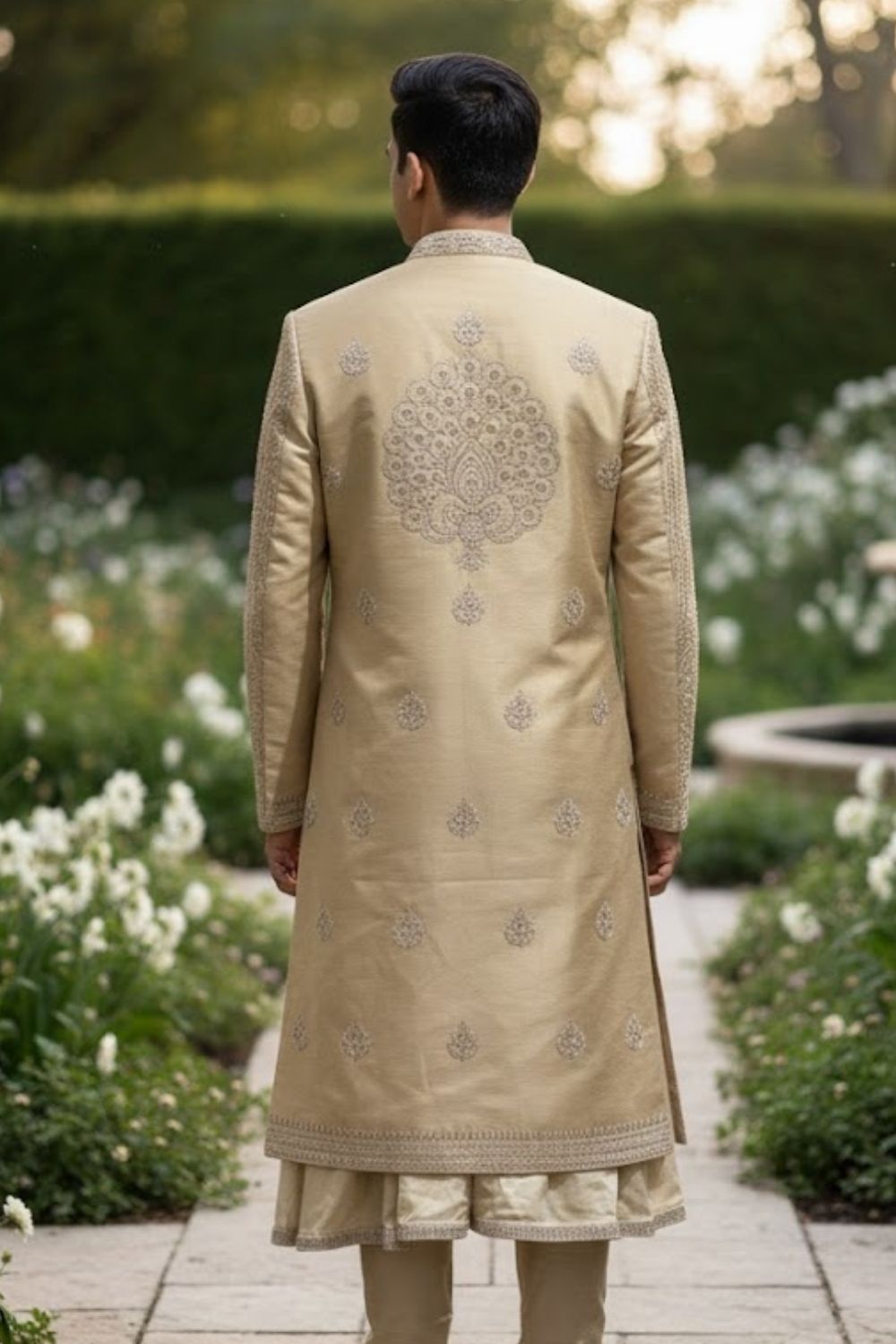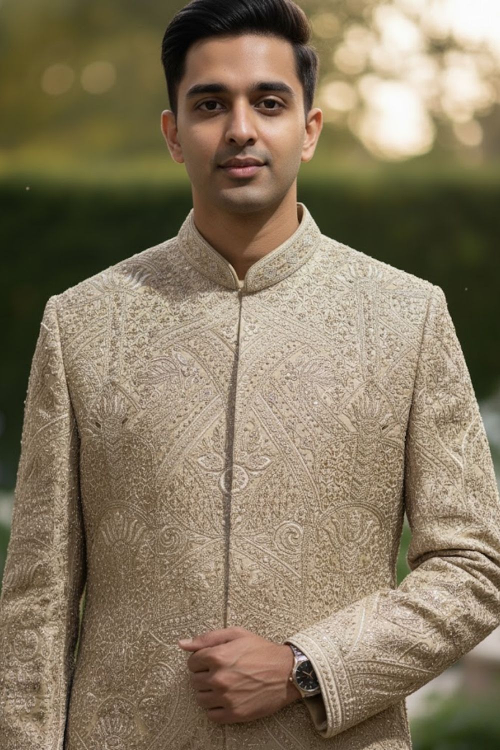 Rent this grand champagne designer sherwani, featuring dense all-over heavy rich embroidery with a matching bordered stole and bottoms.