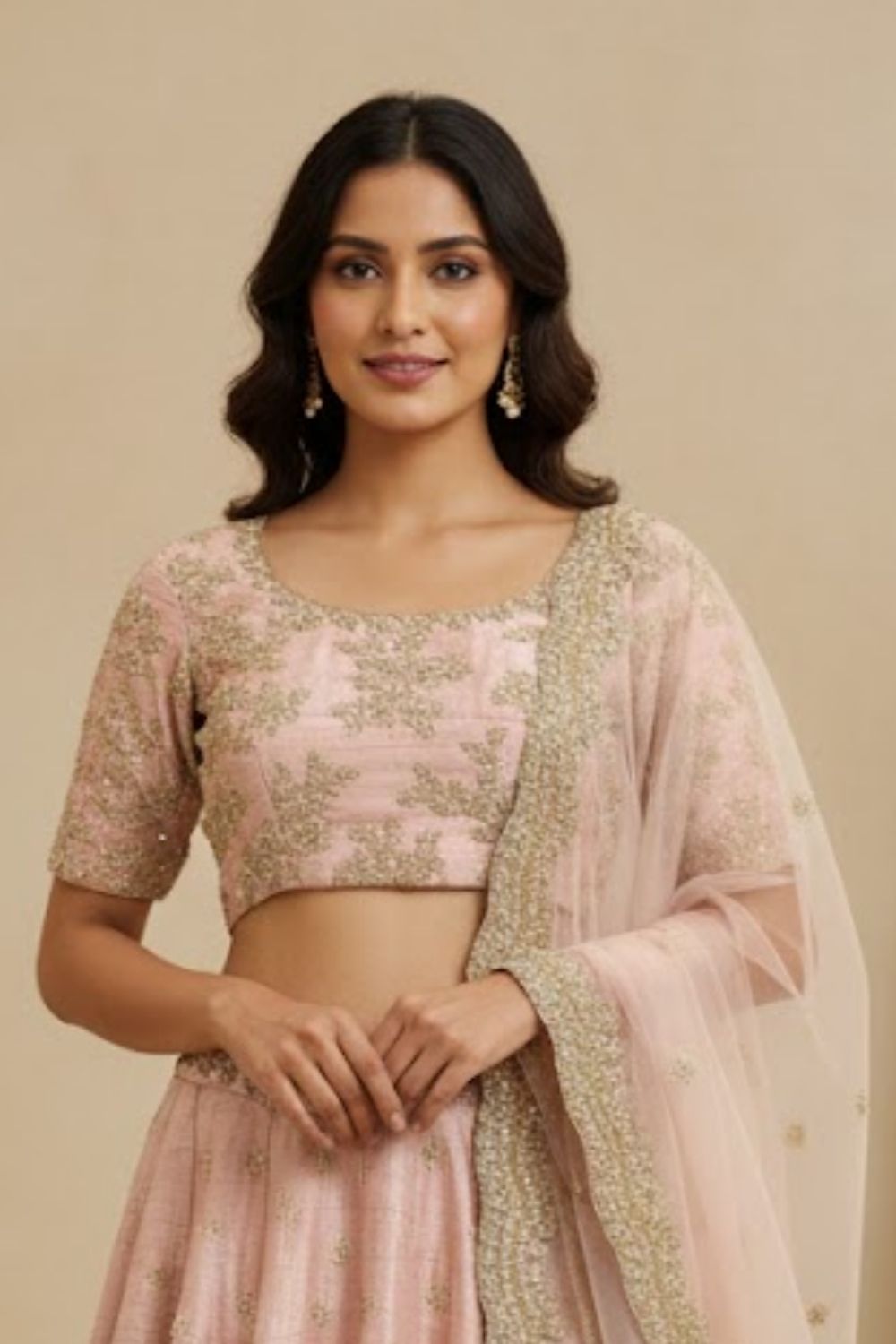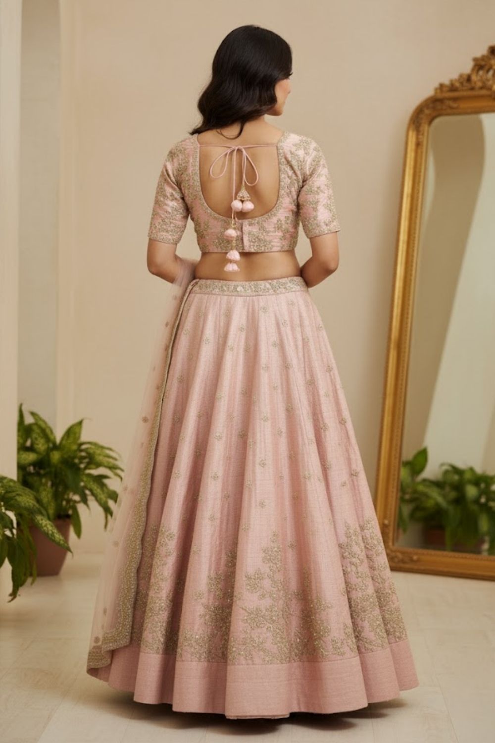 Rent this gorgeous pink bridal lehenga crafted from a raw silk, showcasing delicate dori and thread work in a timeless floral-inspired pattern.