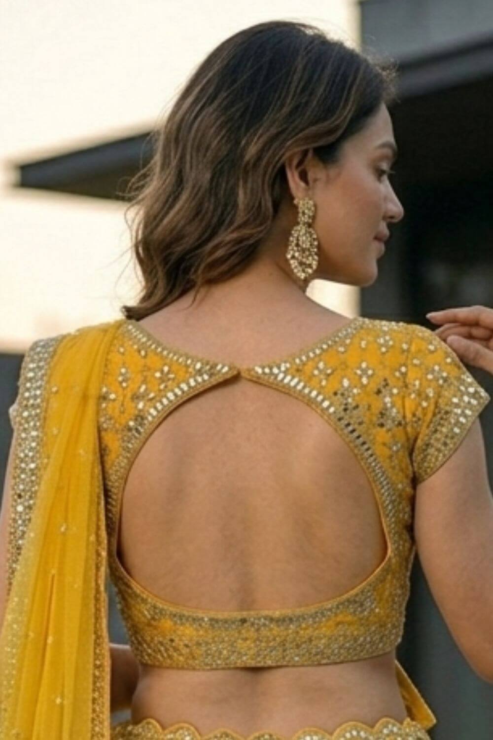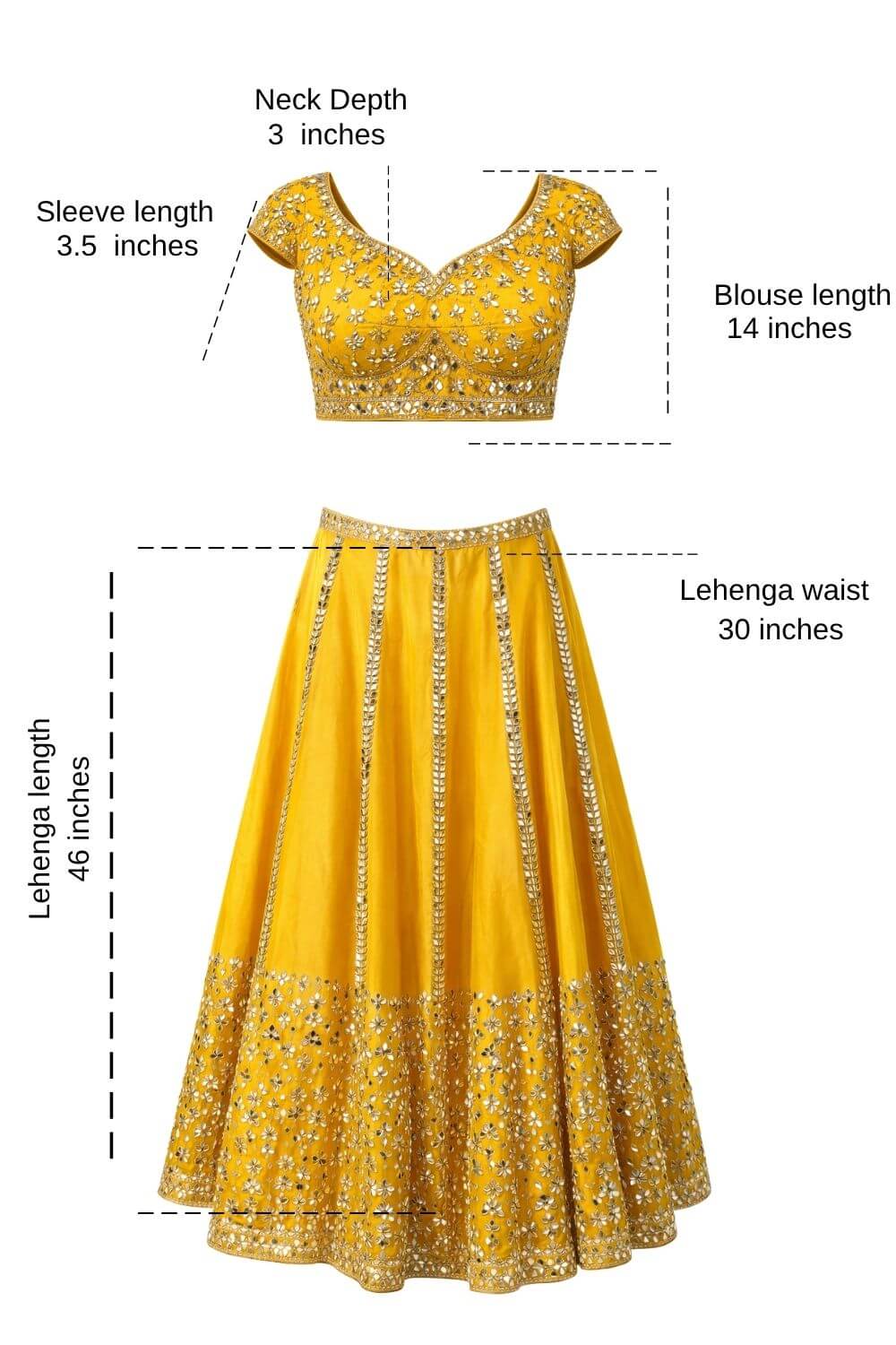 Rent this lightweight mustard yellow net lehenga with intricate mirror work, blouse featuring side zip, adjustable drawstring waist, perfect for haldi ceremonies and festive celebrations.