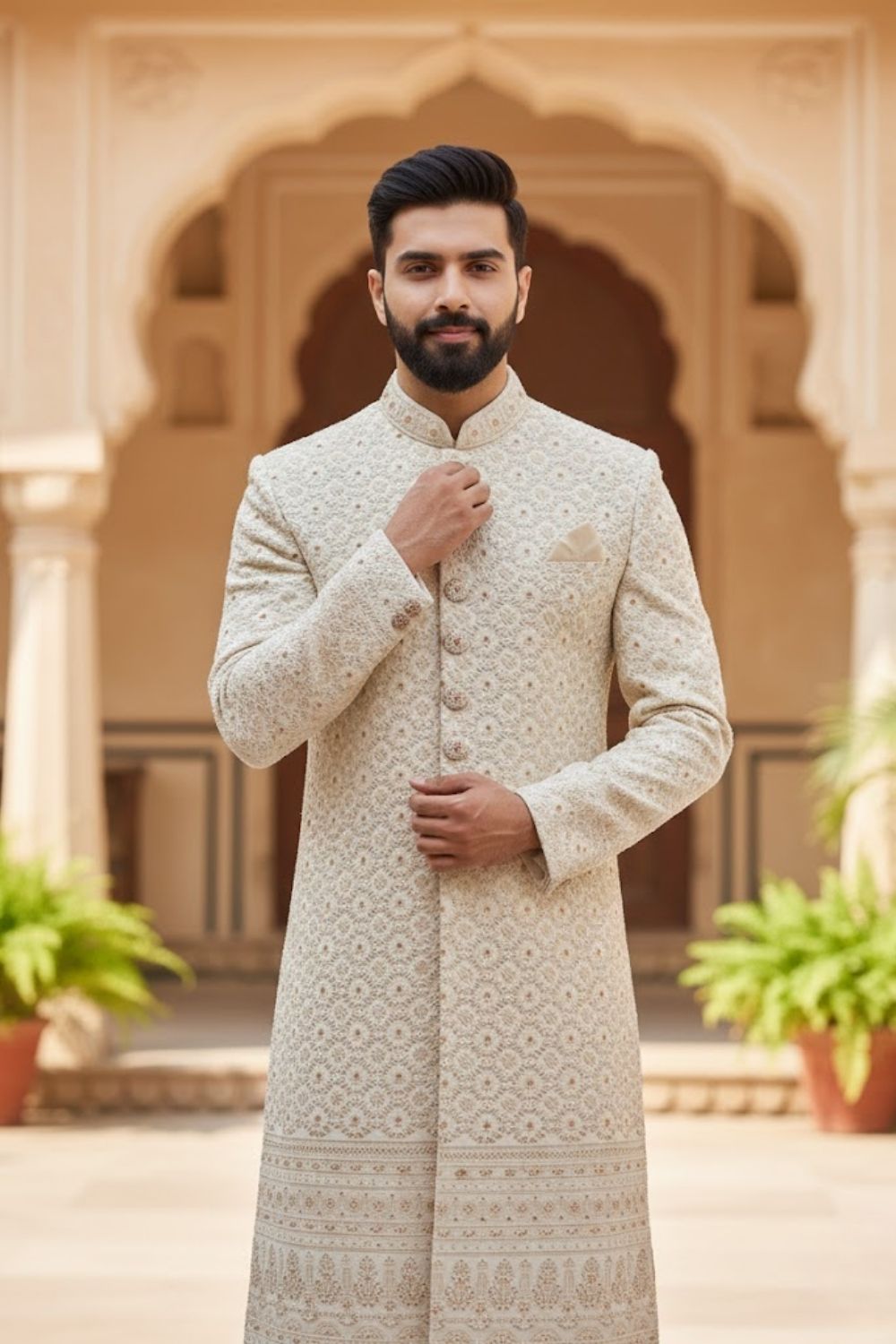 Rent this regal beige beige sherwani made of raw silk, beautifully embellished with rich delicate handwork and metallic buttons.