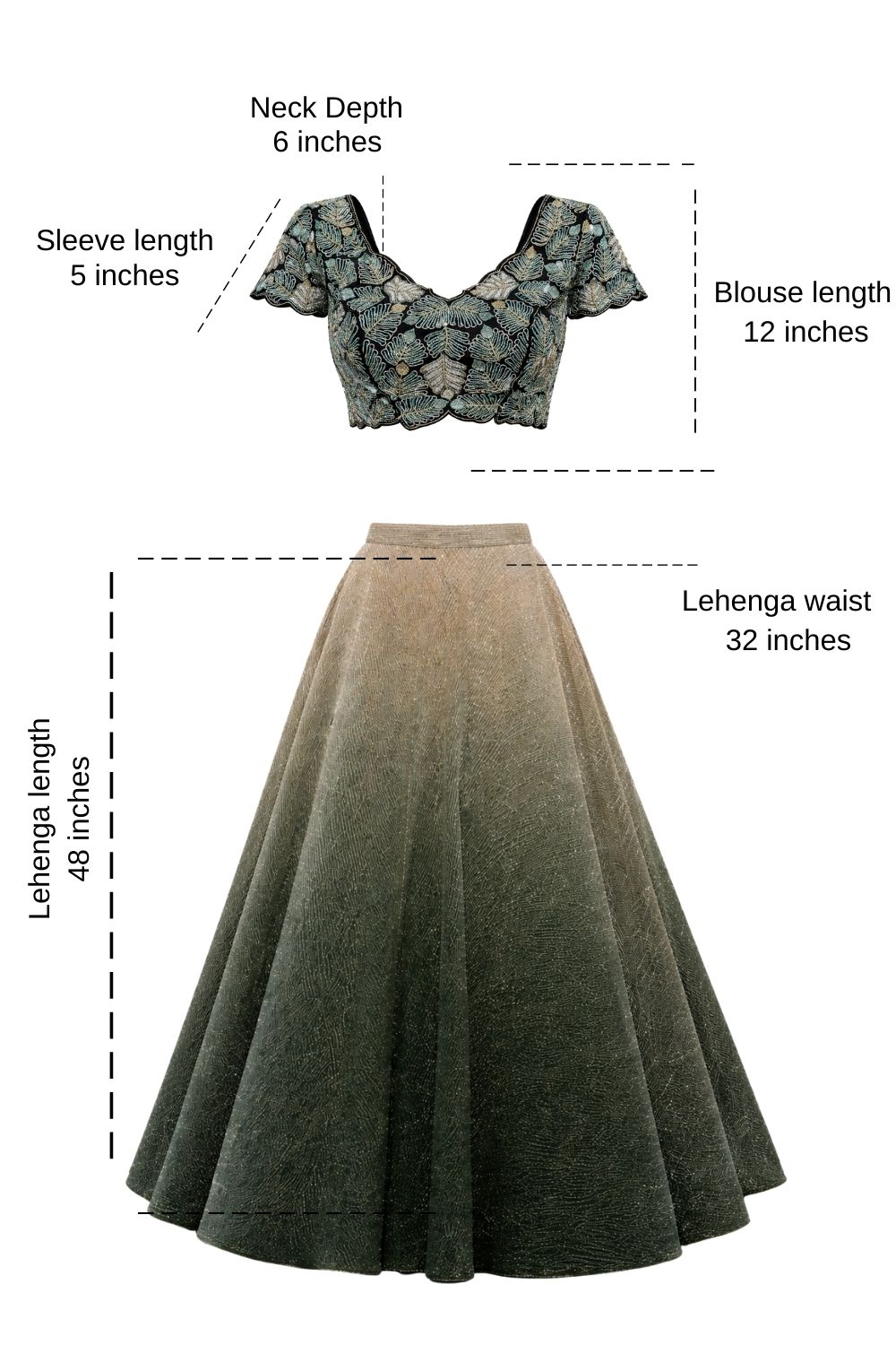 Rent this gold embroidered lycra sequin lehenga with gold-to-green ombre. Cut dana V-neck blouse with back opening and embroidered choker dupatta. Perfect for receptions, sangeet, cocktail events.