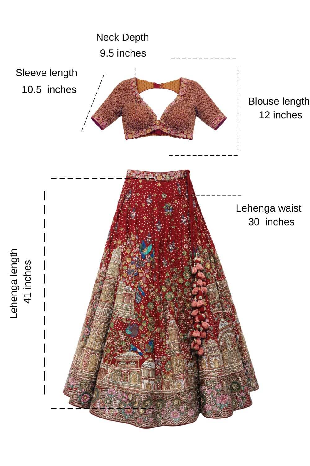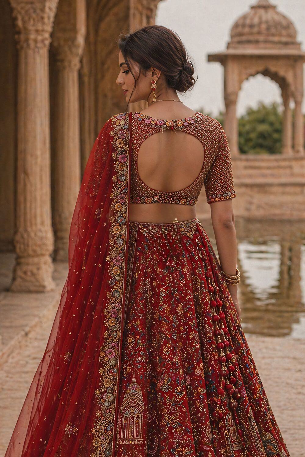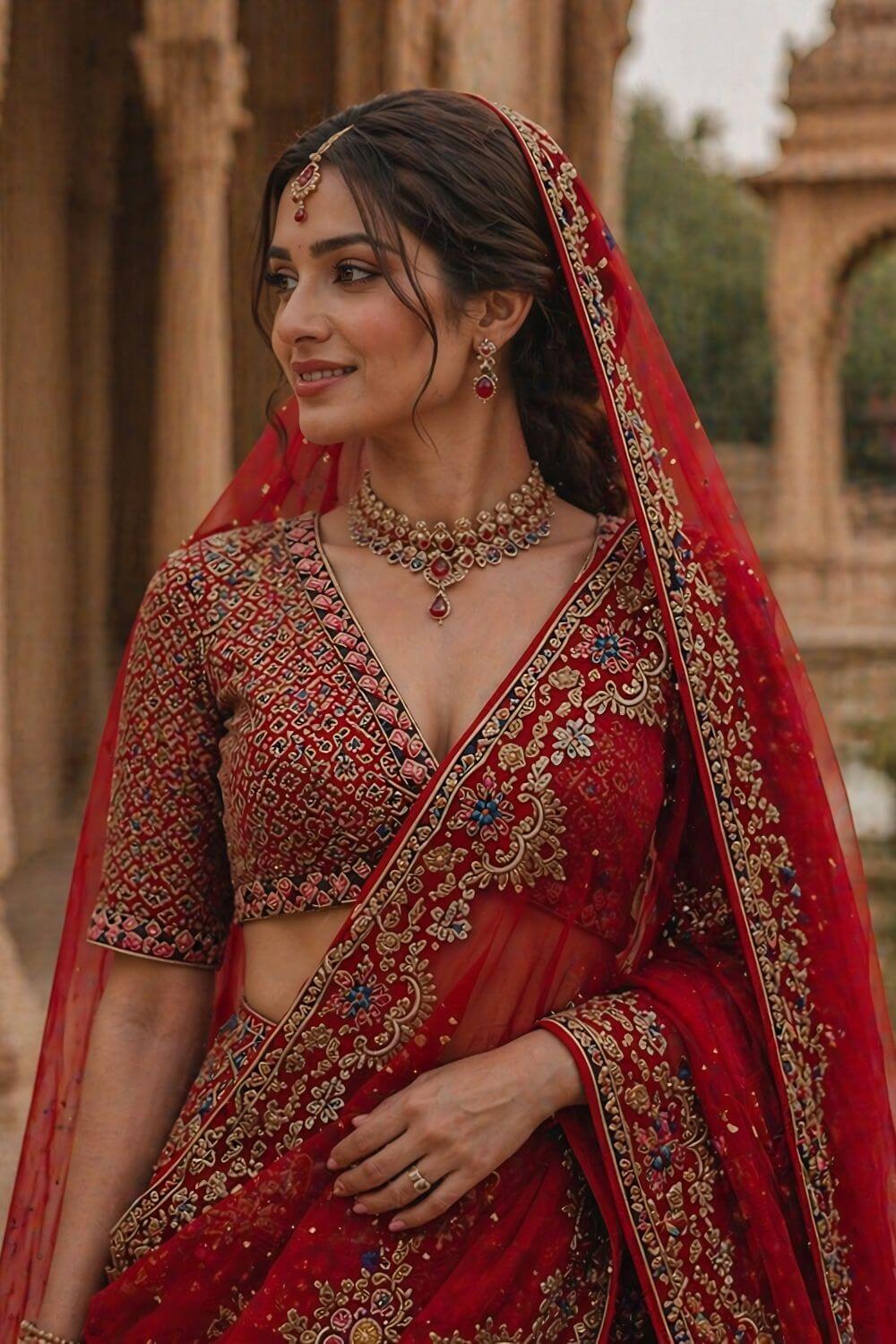 Rent this artistic red silk bridal lehenga with multicolor resham and zardozi embroidery. Includes blouse with back opening, adjustable waist, belt, and double dupattas.