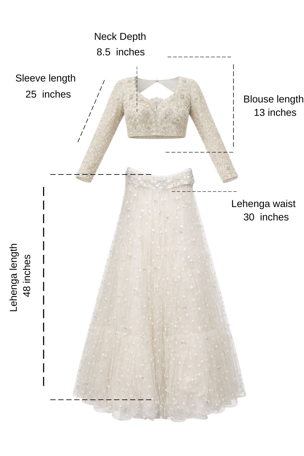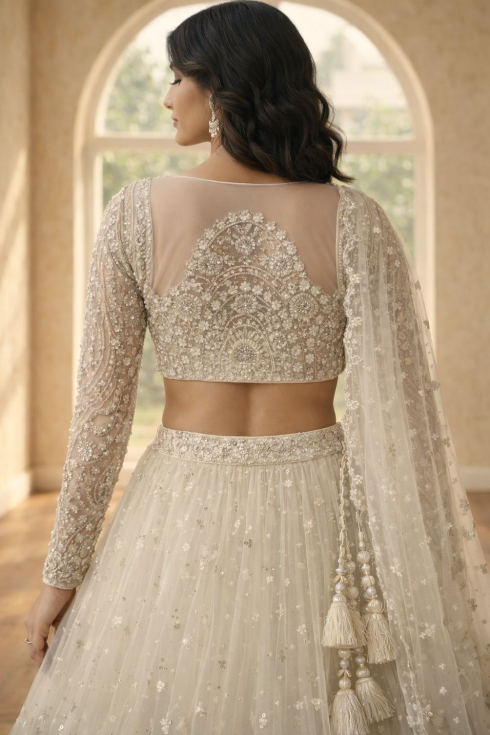 Rent this dreamy white lehenga with intricate cut dana work, shimmering blouse and dupatta. Blouse features side zip, adjustable drawstring waist. Perfect for receptions, bridal trousseau.