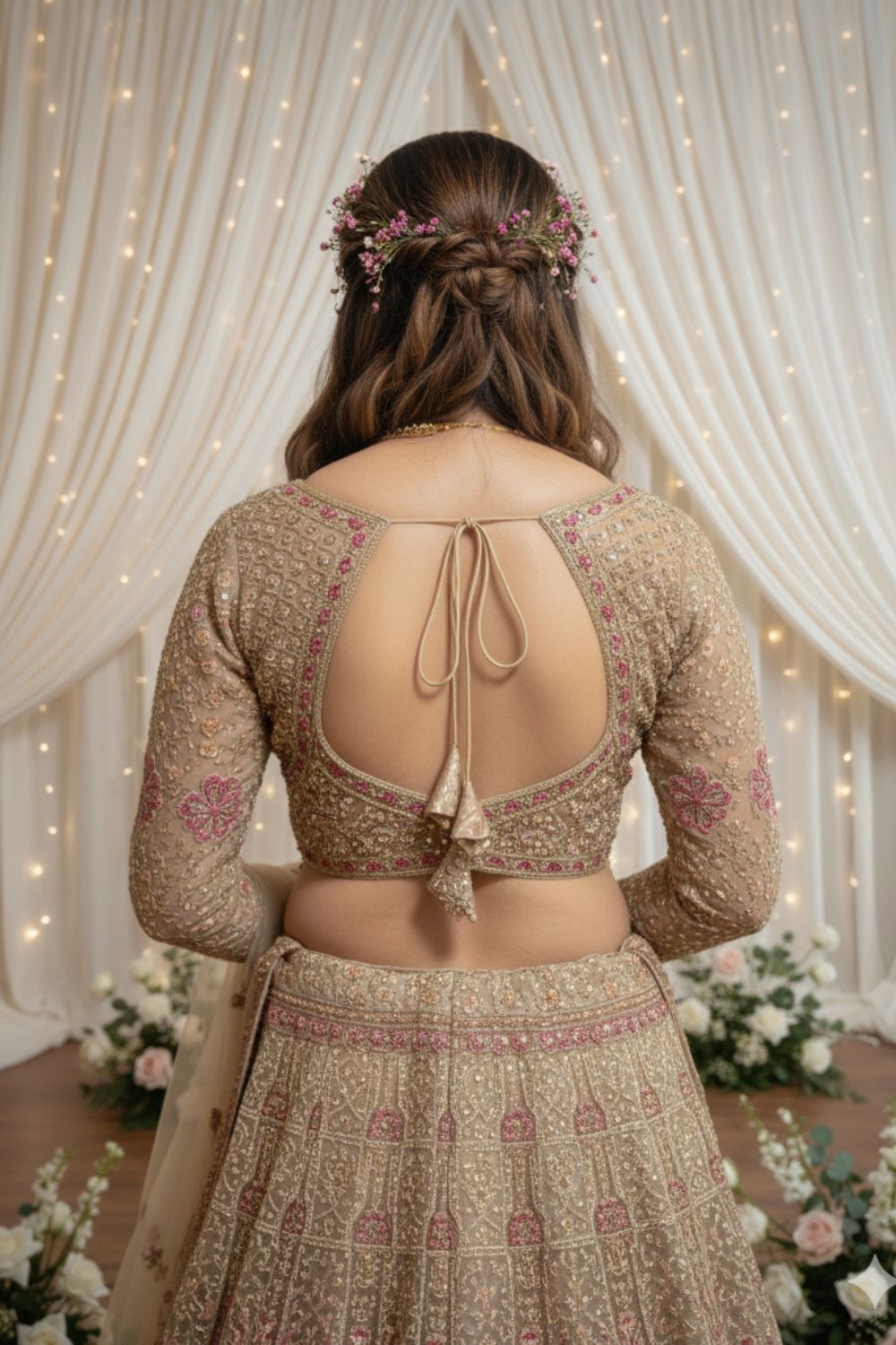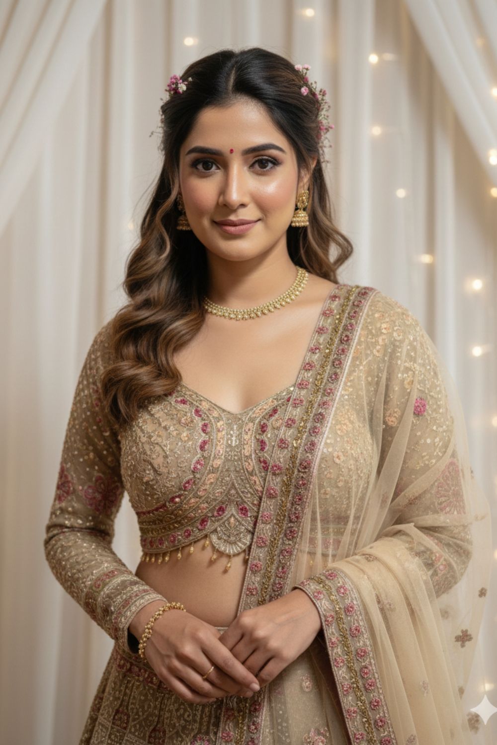 Beige embellished lehenga with pink detailings styled with a blouse and a dupatta