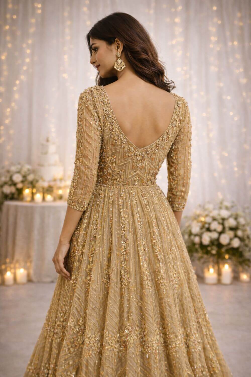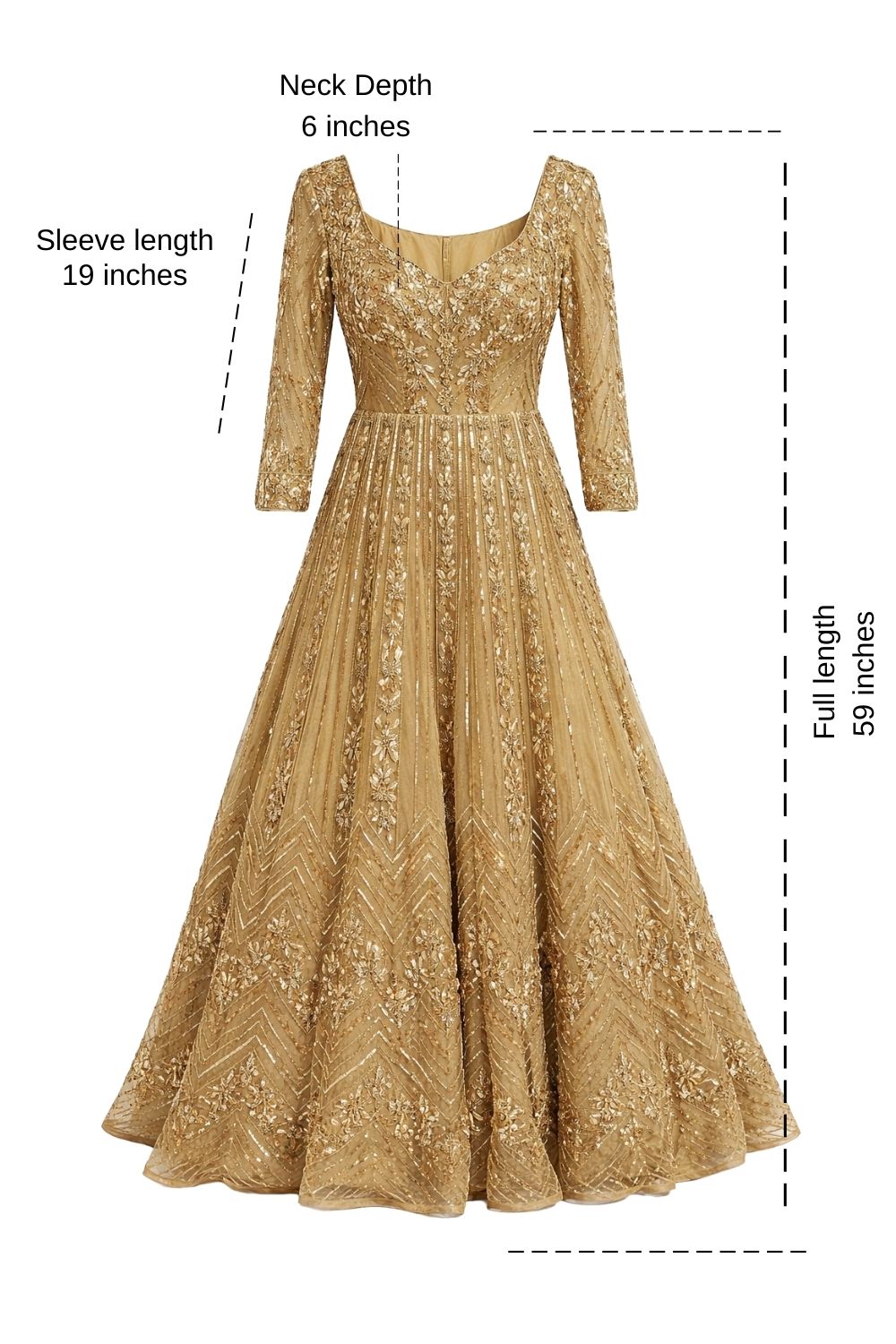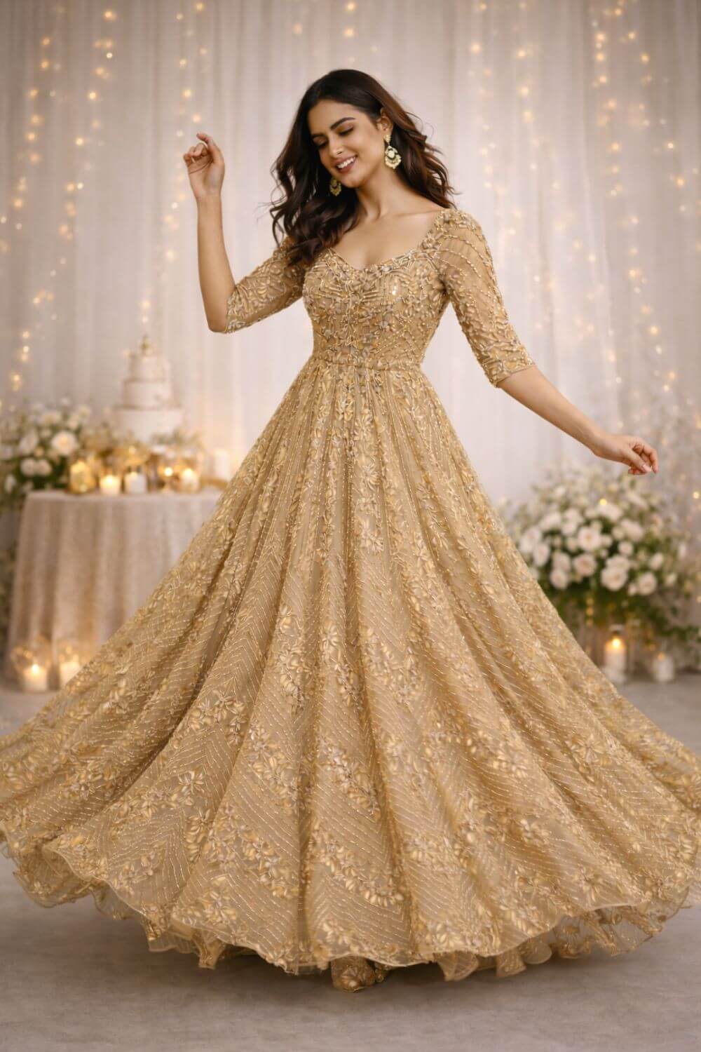 Golden embellished engagement gown for rent with intricate sequin and thread embroidery on net. Elegant neckline, flowy silhouette, perfect for engagement ceremonies and receptions.