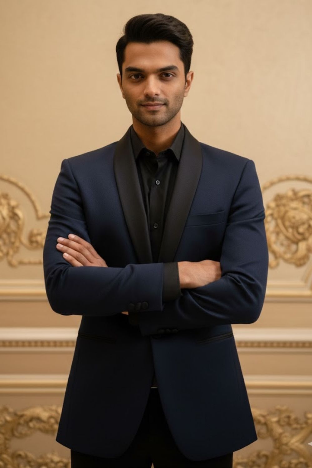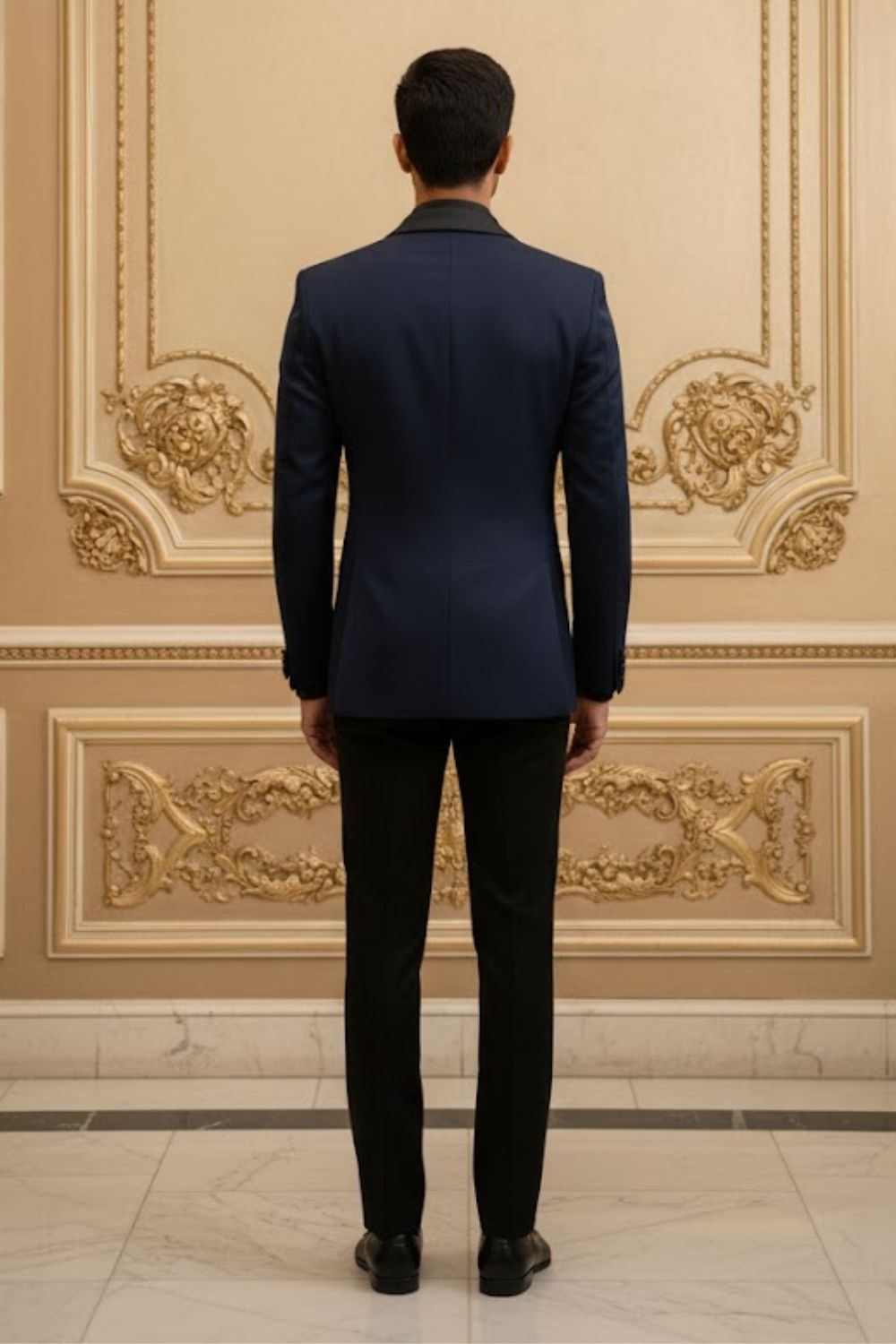 Rent this sharp navy blue tuxedo jacket in structured suiting fabric, featuring a contrasting black satin shawl lapel for sophisticated wear.