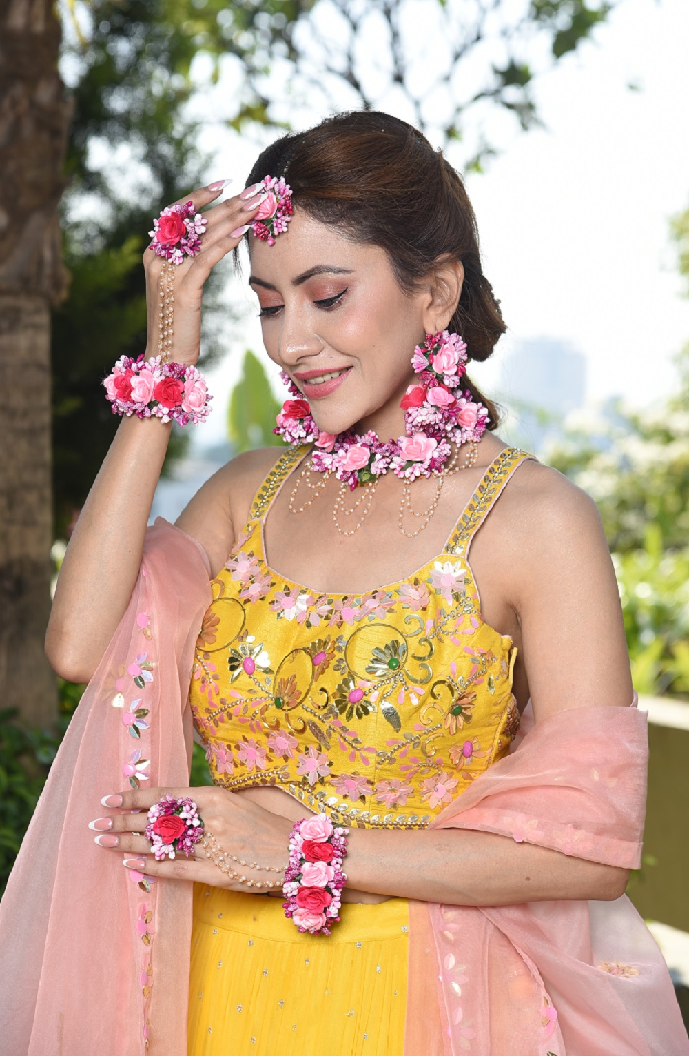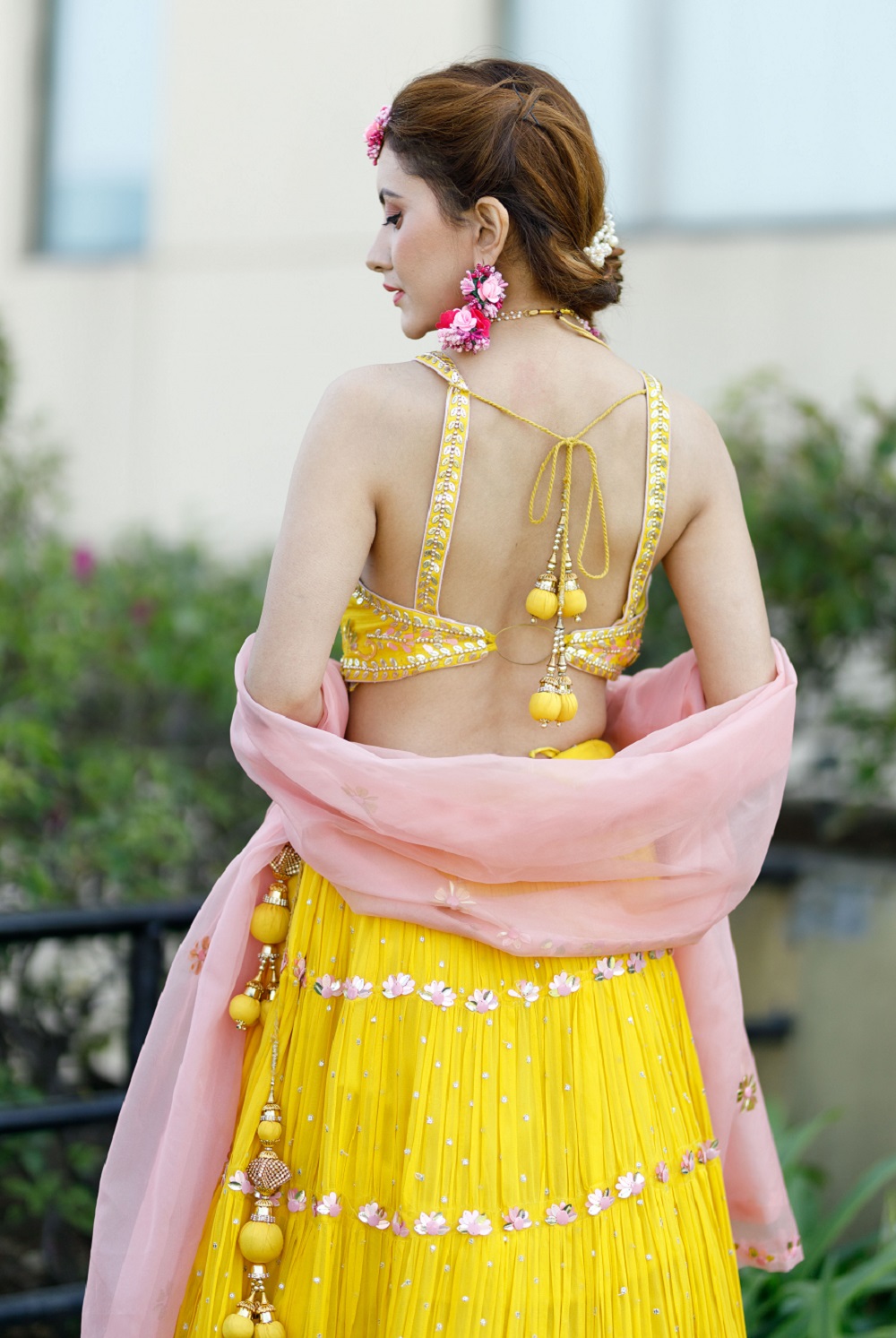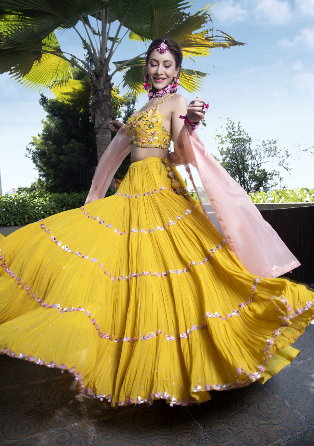Rent this Yellow tiered lehenga featuring sequin work, paired with a blouse adorned with embroidered flowers and a pink net dupatta, creating a vibrant and enchanting ensemble.