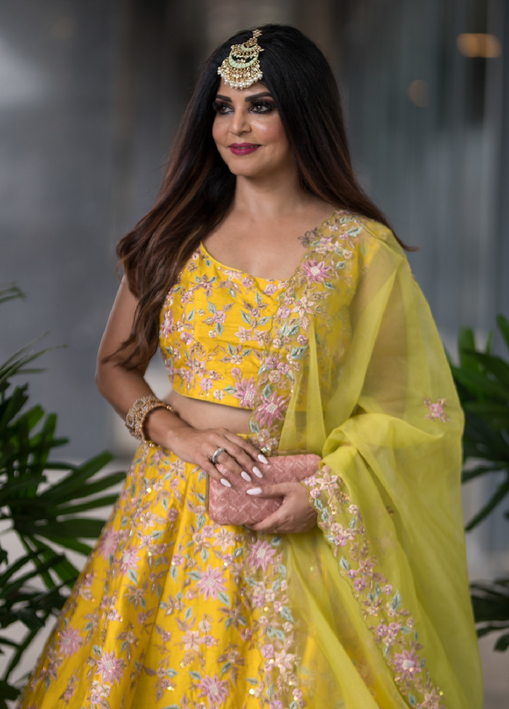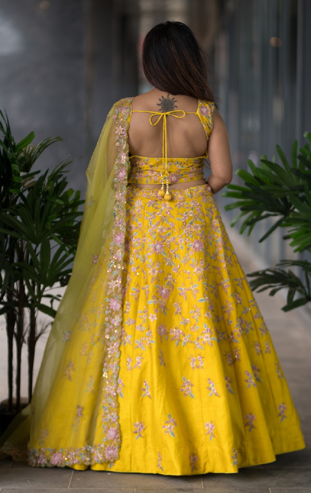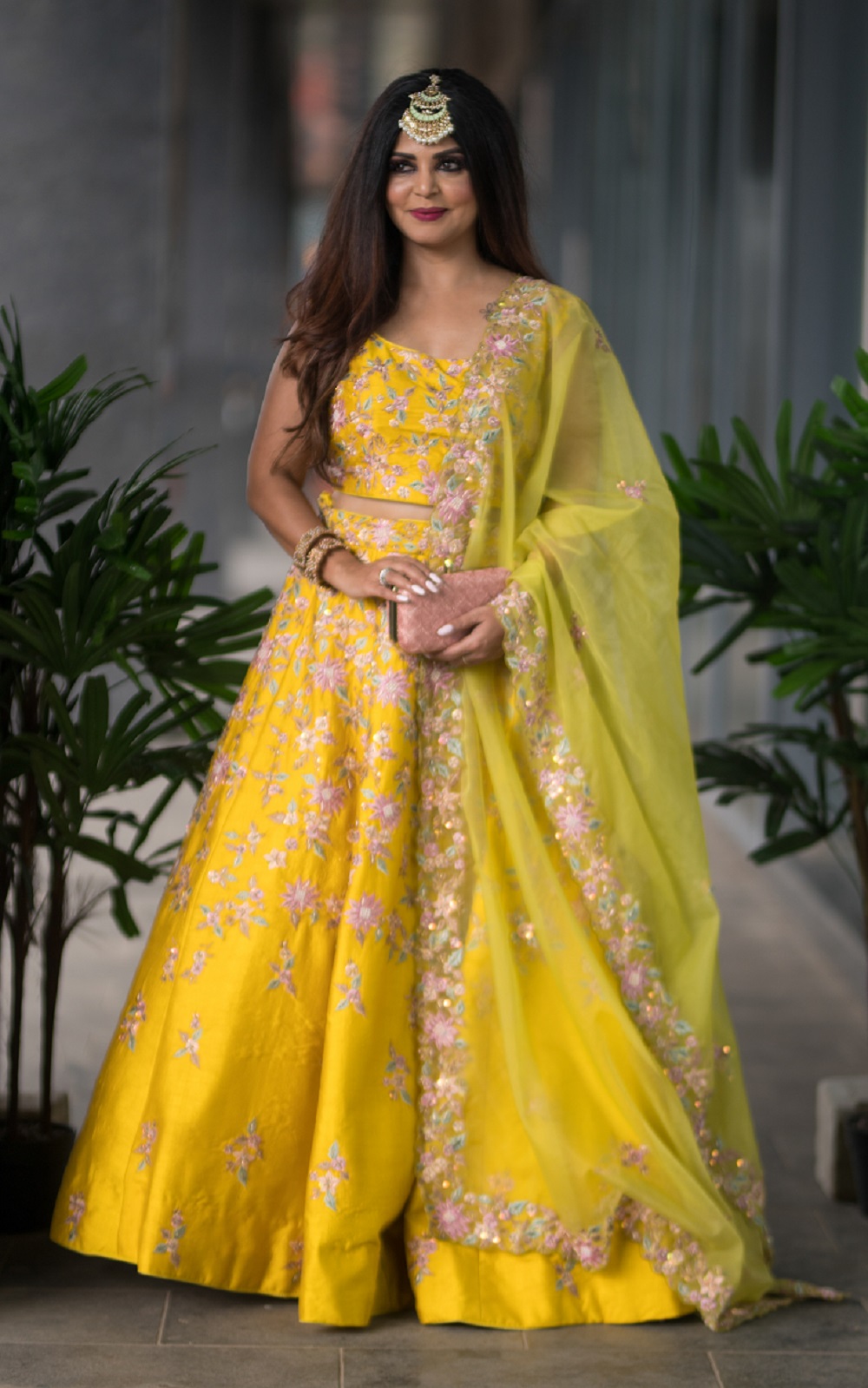 A beautiful Yellow lehenga featuring intricate floral thread work, paired with a matching blouse and a lime green dupatta, creating a vibrant and elegant ensemble.