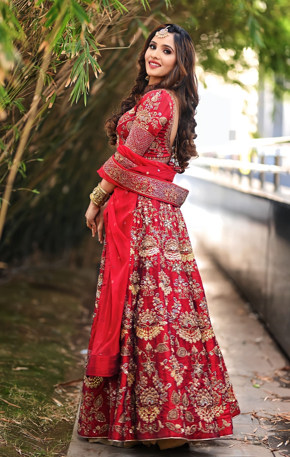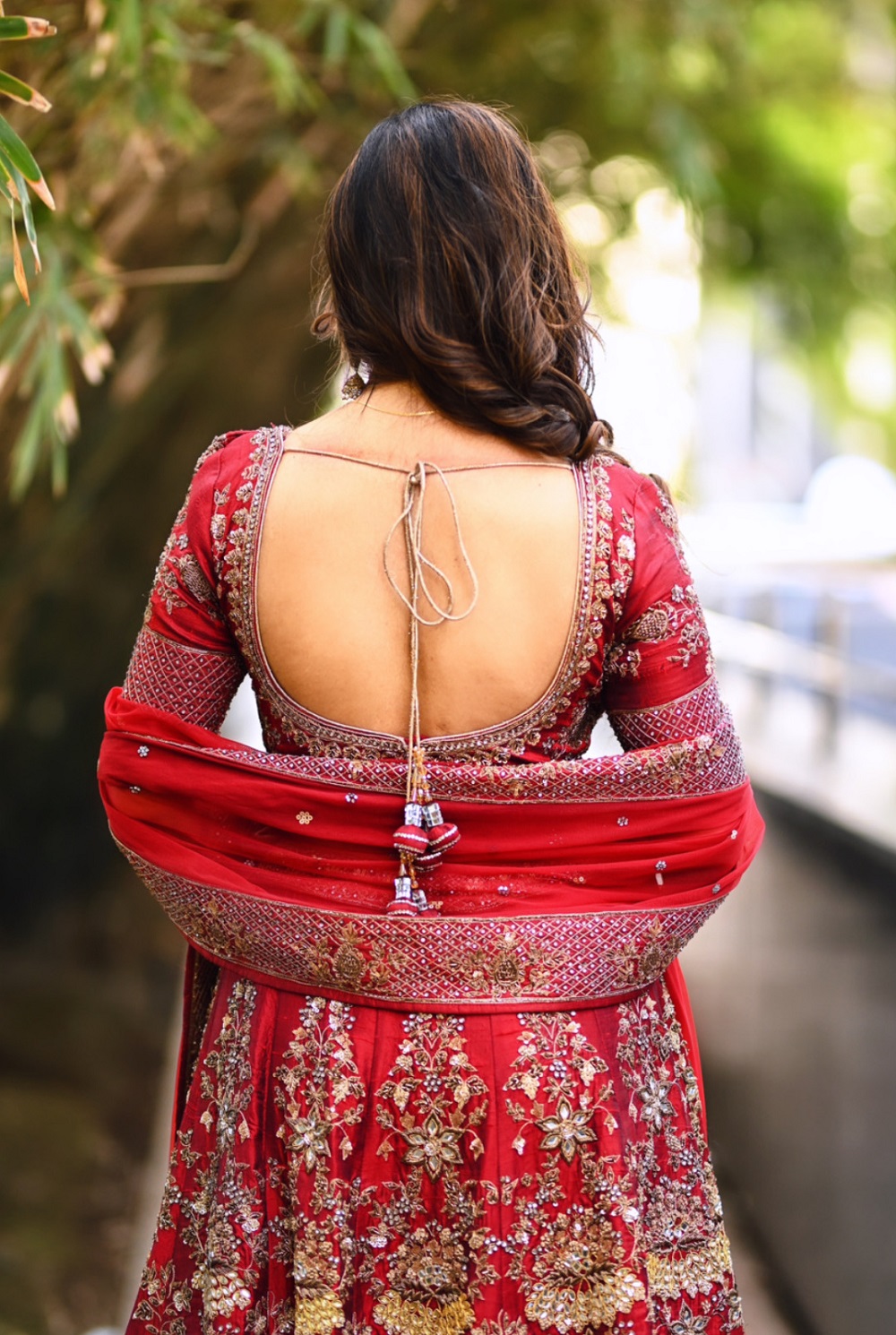 Rent this gorgeous Maroon Raw Silk Bridal Lehenga embellished with dense metallic gold thread work in large traditional floral motifs, paired with beautiful blouse and net dupatta.