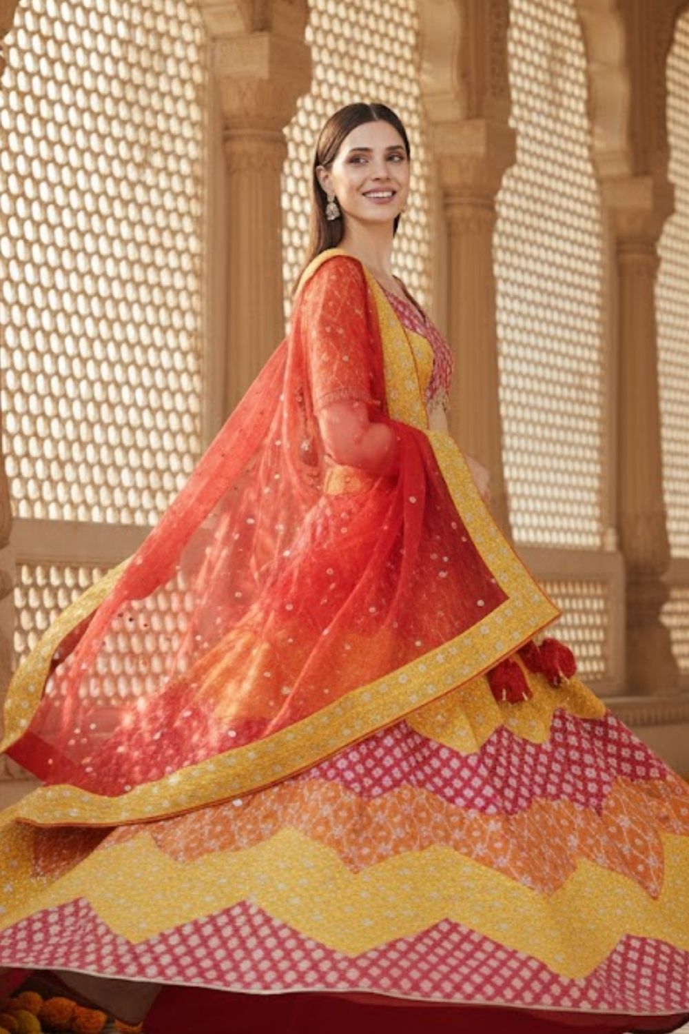 Rent this festive yellow and red lehenga set in a rich dupion silk, highlighted by dense silver sequin and thread embroidery detailing the entire skirt and blouse.