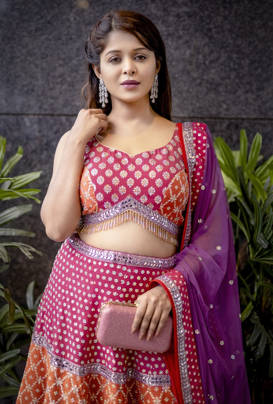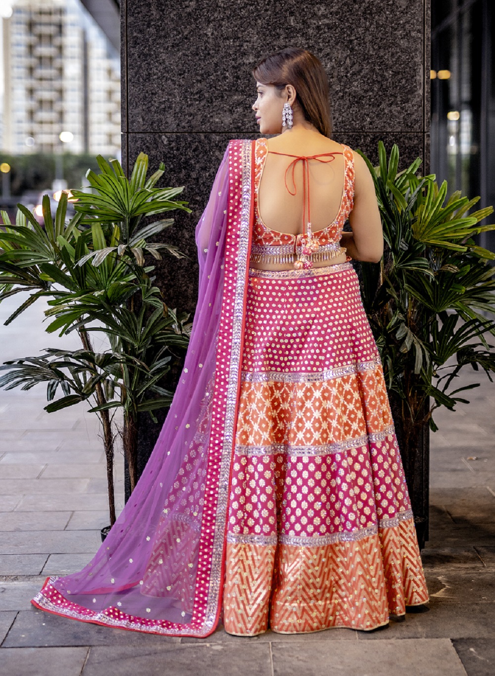 Rent this vibrant fuchsia and orange paneled lehenga set, crafted in a raw silk, featuring detailed all-over sequin work and multi-patterned embroidery across the skirt.