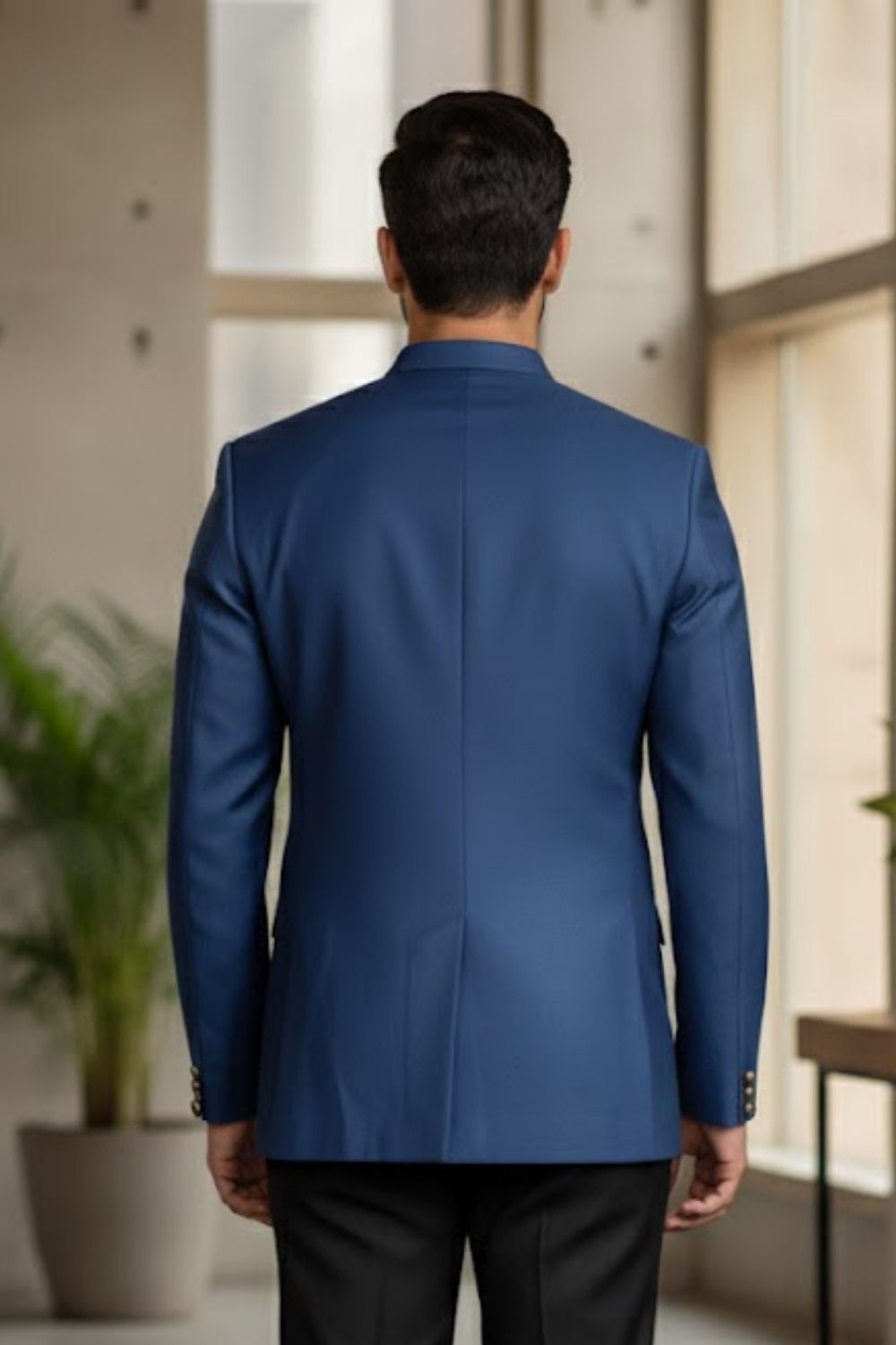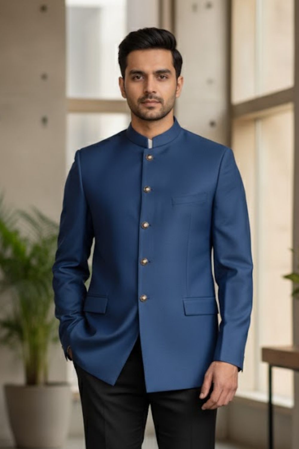 Rent this modern dark blue bandhgala jacket in fine suiting fabric, featuring a sleek minimalist design with polished gold button detailing.