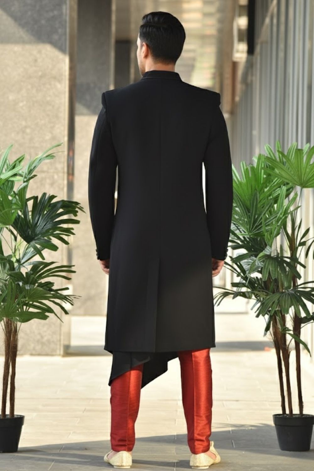 Rent this black Indo-western outfit with cowl drape cut, paired with red pants for a bold contemporary look.