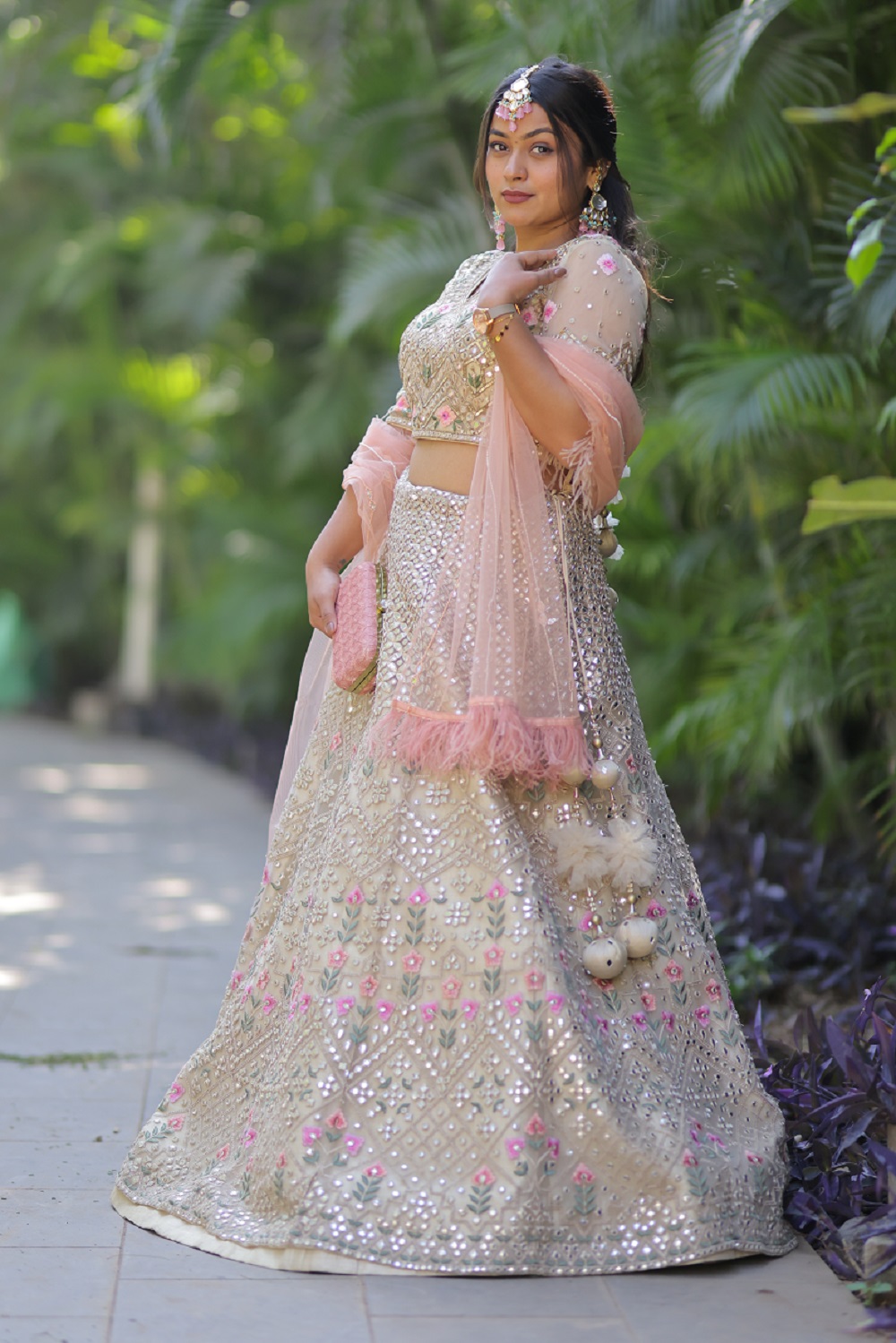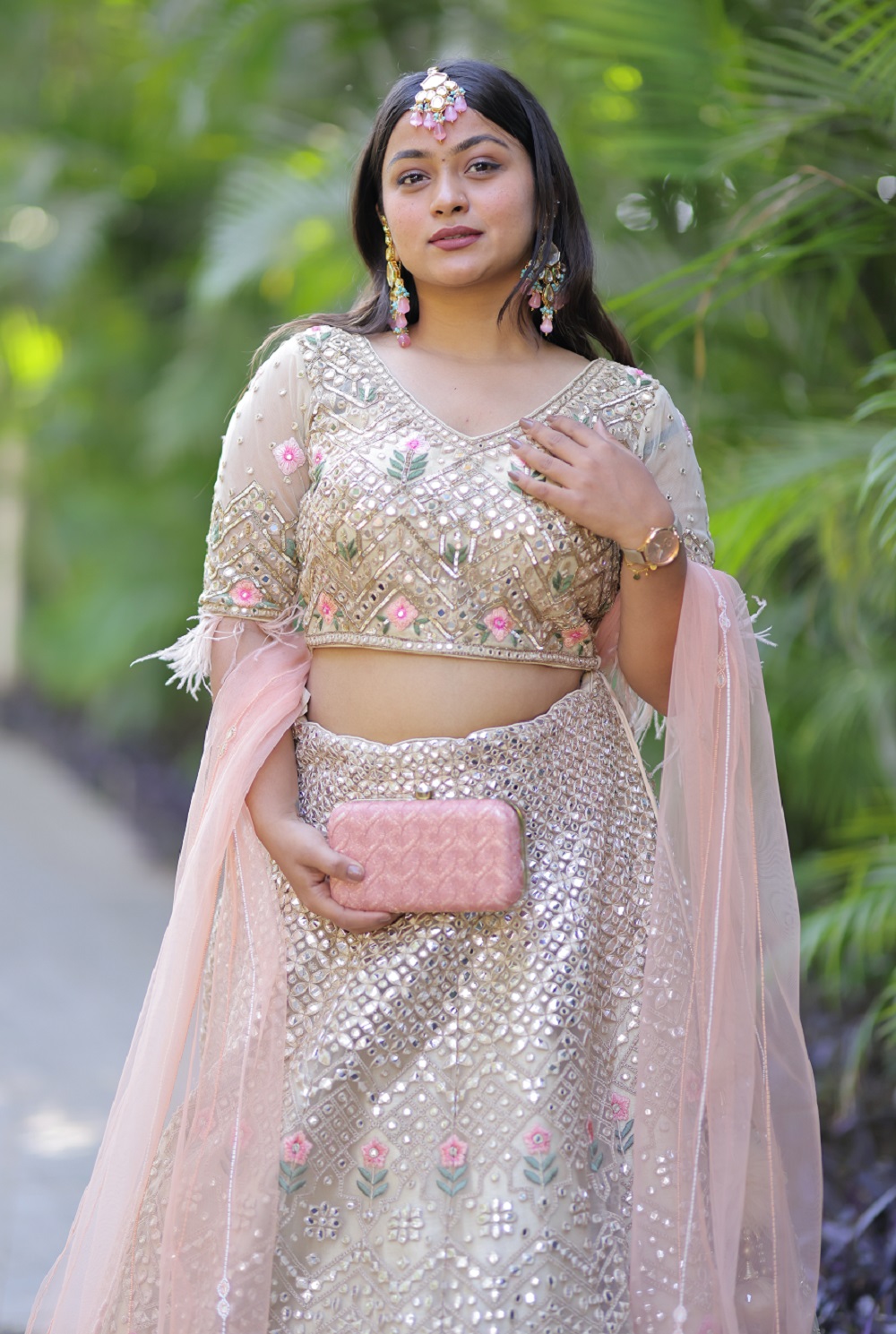 Beige lehenga with gotta patti, floral embroidery paired with a matching blouse and a peach dupatta