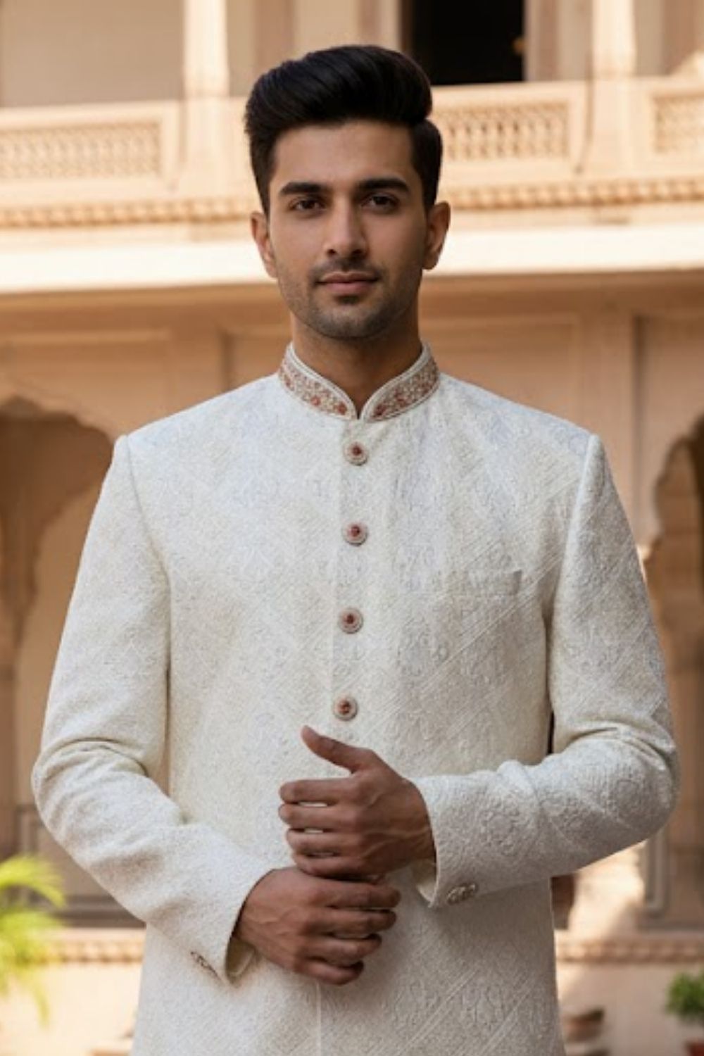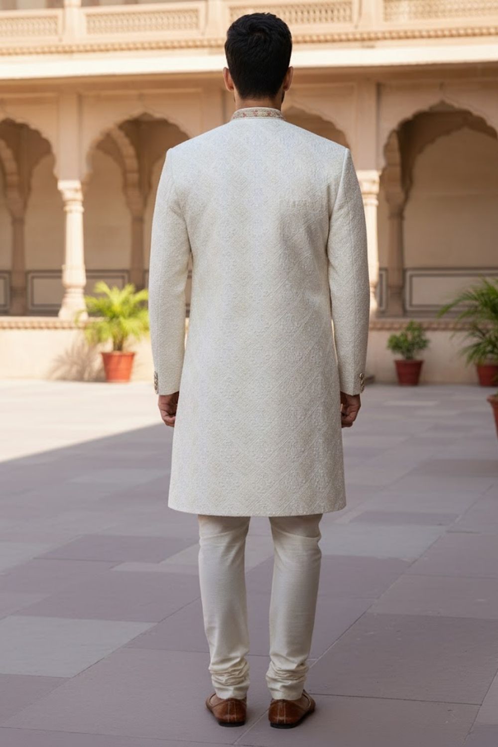 Rent this majestic cream sherwani, showcasing intricate white-on-white self-work over a brocade fabric, finished with maroon and gold detailing on the buttons and collar.